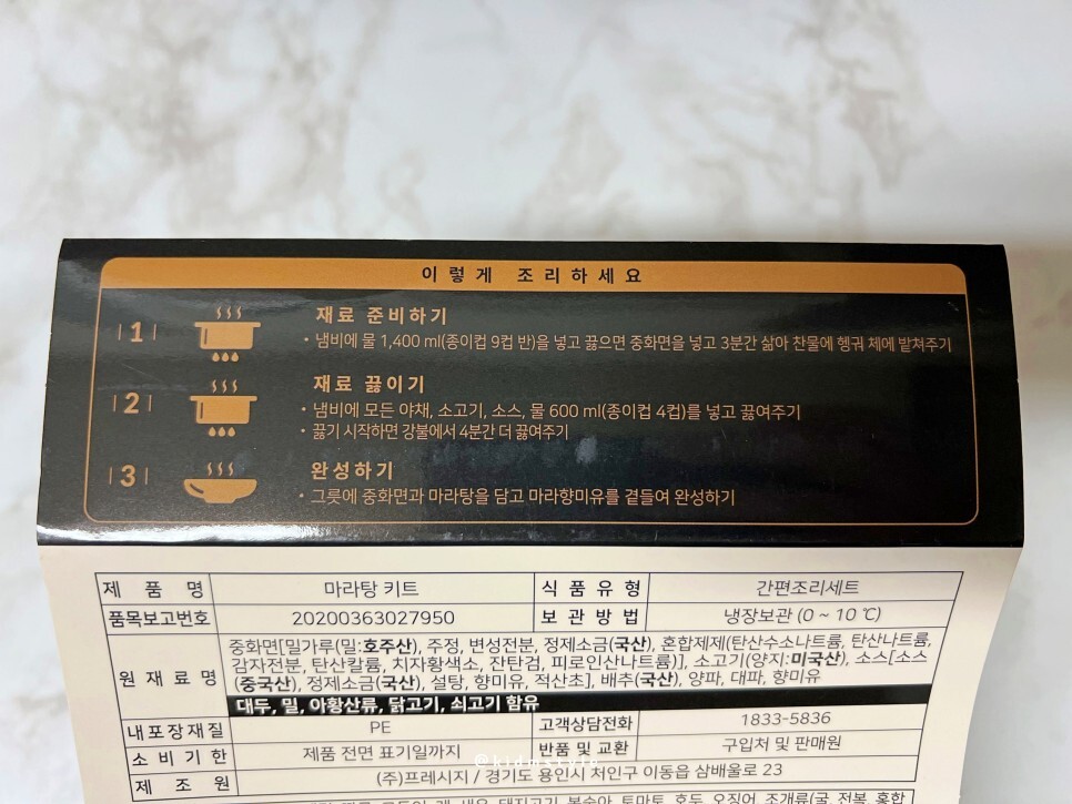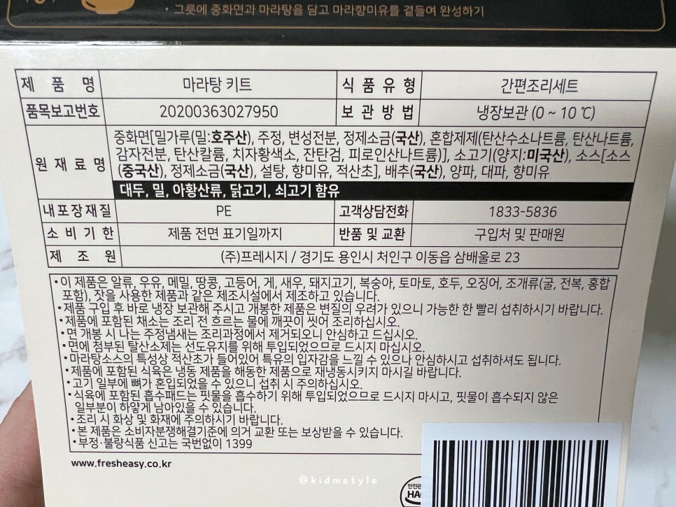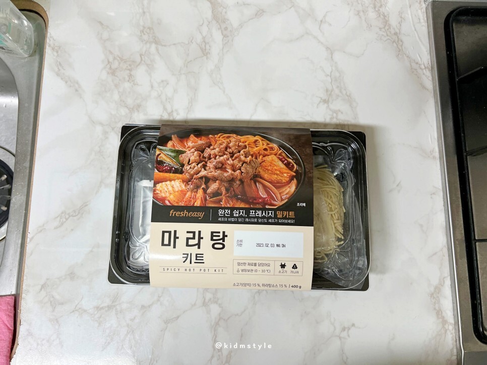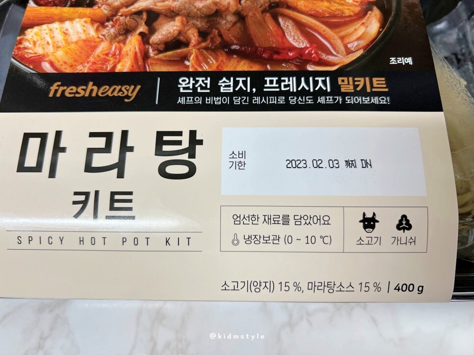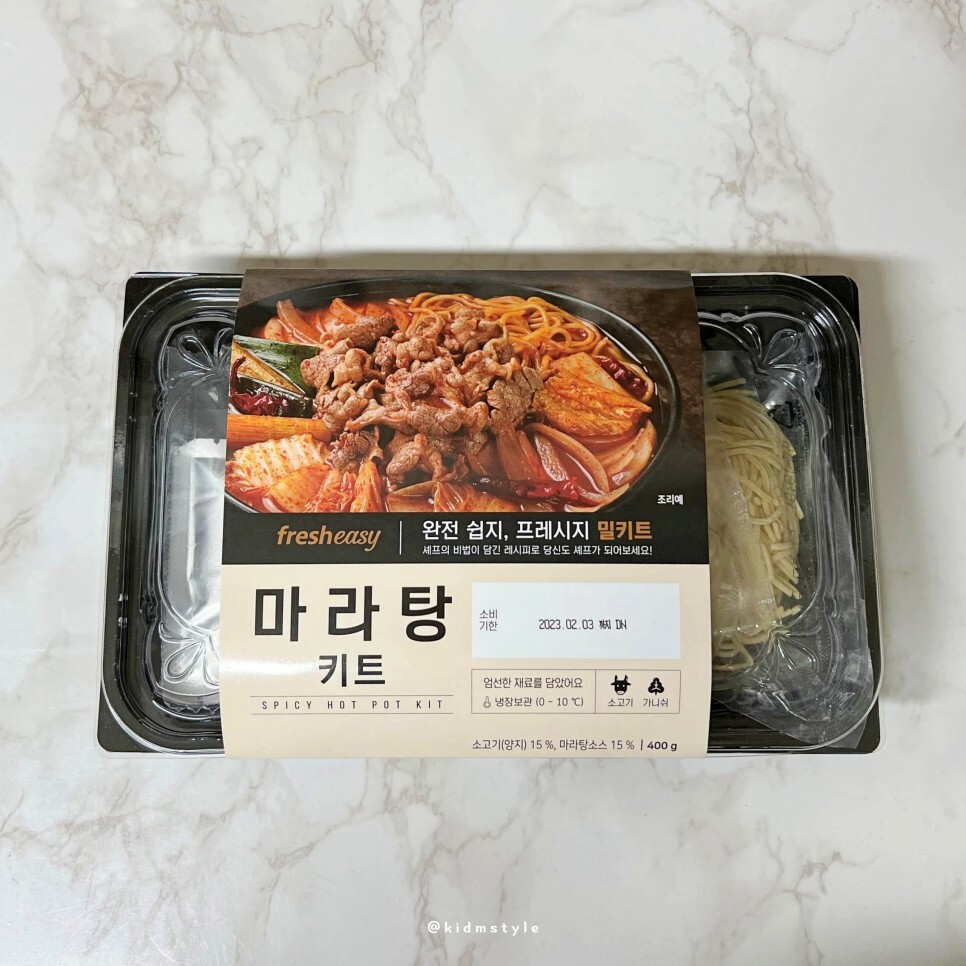 완전 쉽지! 프레시지 밀키트 마라탕 키트입니다. 냉장 보관이라 소비기한이 5일 정도로 짧은 편입니다. 소고기 (양지) 15%, 마라탕 소스 15% 등 총 400g의 구성입니다.