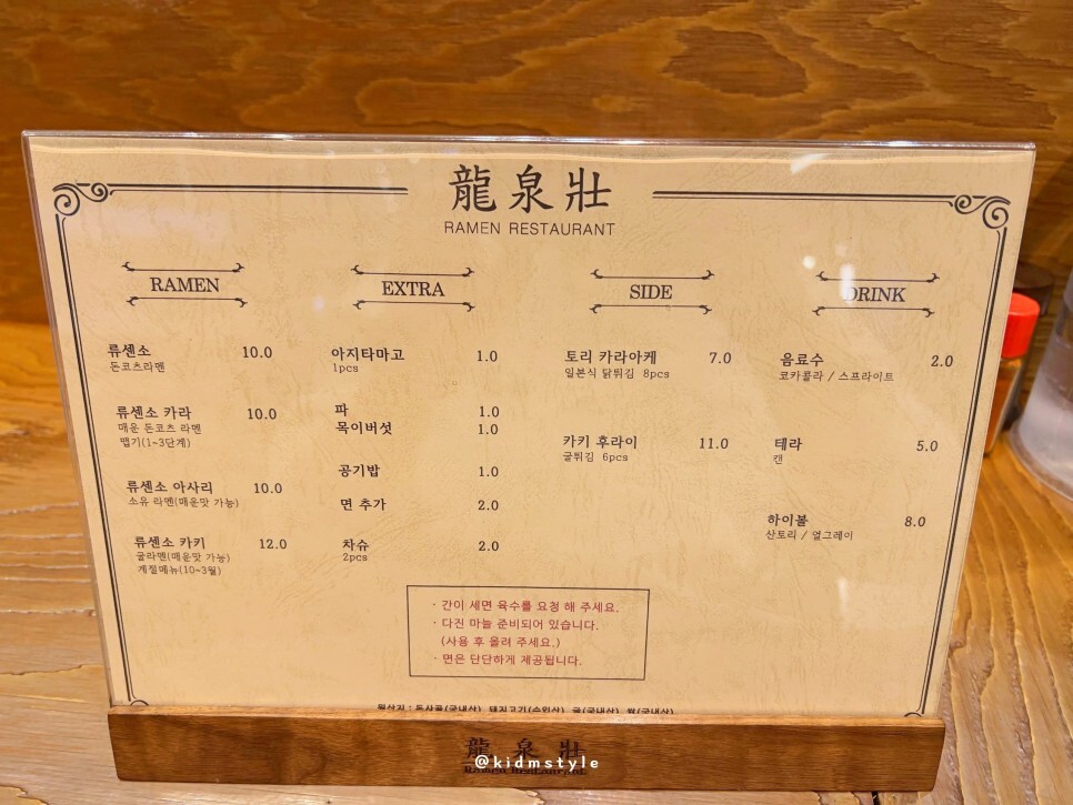 메뉴판입니다. 육수의 간을 조절할 수 있습니다. 돈코츠라멘을 워낙 좋아하다 보니 류센소로 주문합니다.