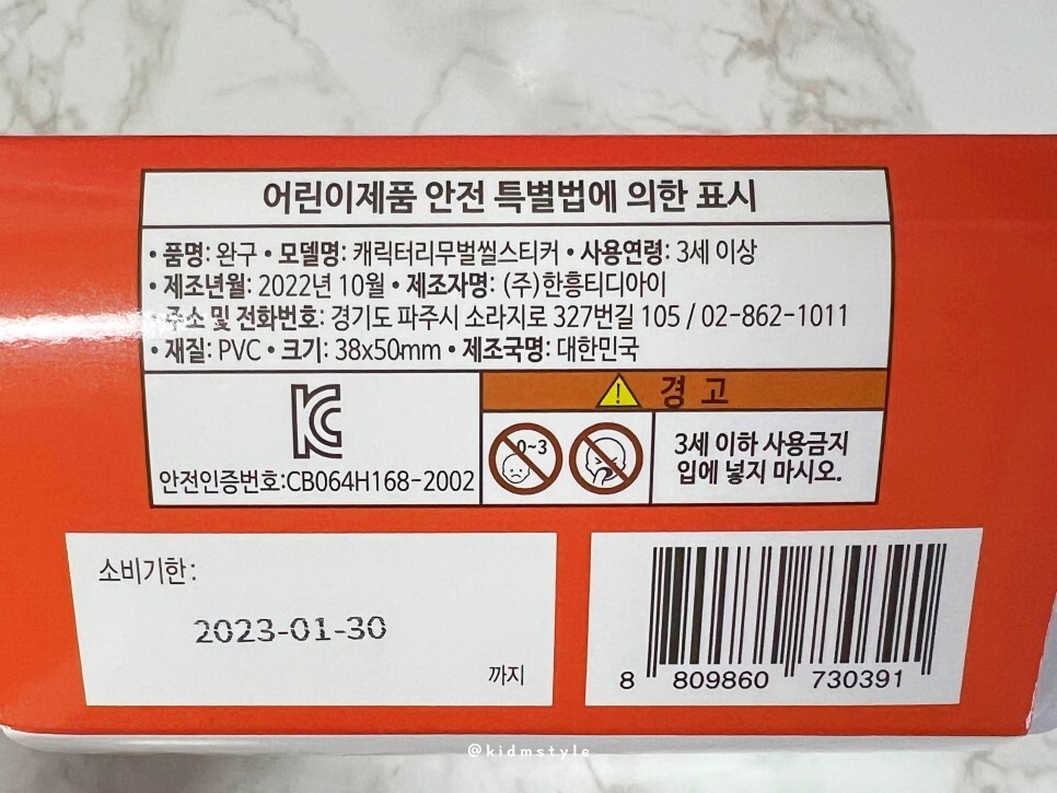 짱구 캐릭터 스티커가 들어가 있어서 어린이 제품 안전 특별법에 의한 표시가 적혀있네요. 소비기한은 며칠 되지 않으며 짧은 편입니다.