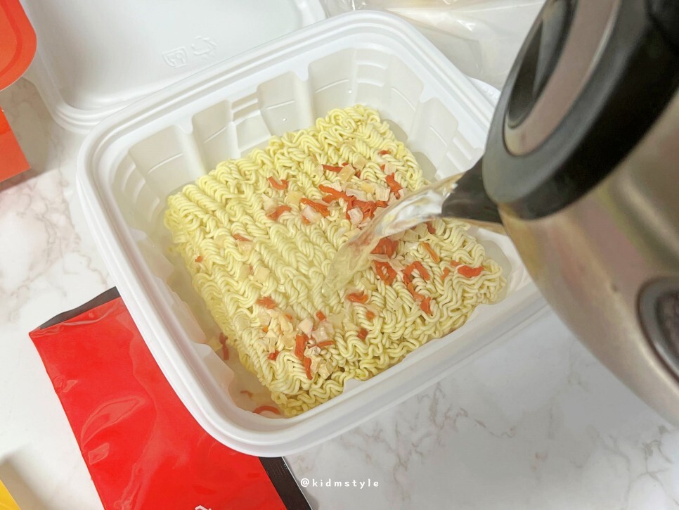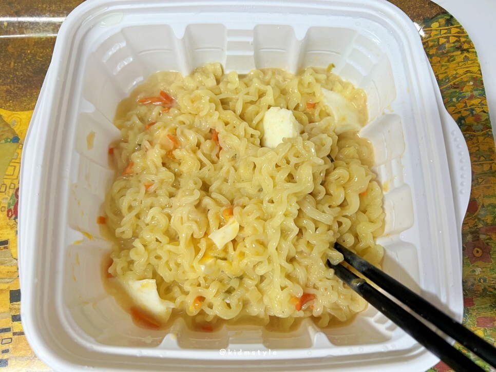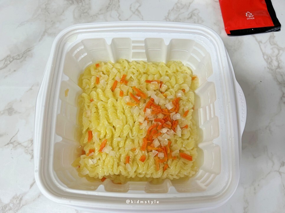 뚜껑을 닫고 전자레인지에 넣고 돌립니다. 이 제품은 어린이용 라면인데 조리는 어린이가 하기에 조금 위험한 것 같네요. 특히 전자레인지에 넣을 때 조심해야 합니다. 용기가 뜨거워서 아이들이 직접 하면 위험하고 물을 따라 버릴 때도 조심해야겠네요.