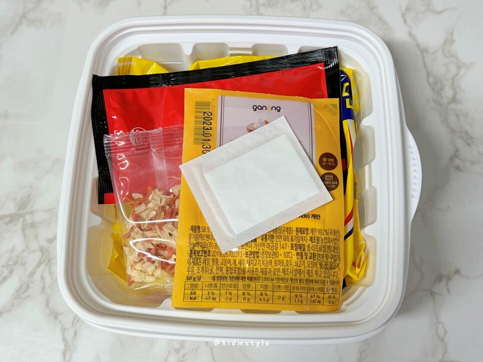스티커, 수란, 소스, 야채 후레이크, 라면사리 등의 구성입니다.