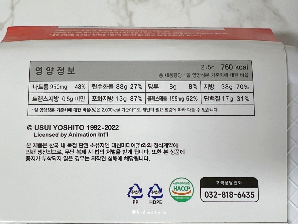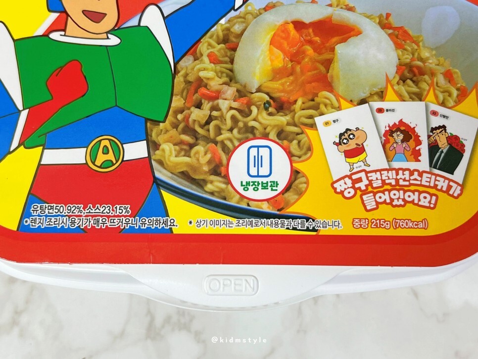 215g에 760kcal, 유탕면과 소스의 구성이며 특이하게 냉장 보관 제품입니다. 짱구 컬렉션스티커가 들어가 있어요. 조리 예 사진을 보니 상당히 기대가 됩니다.