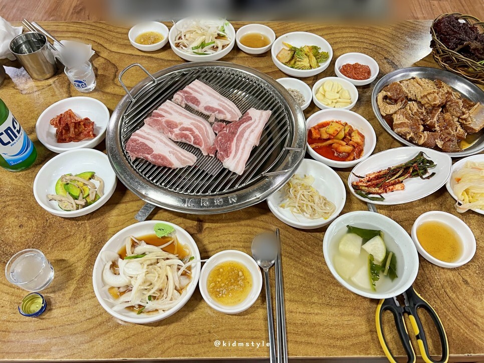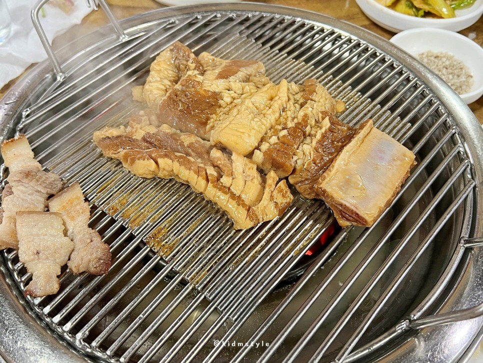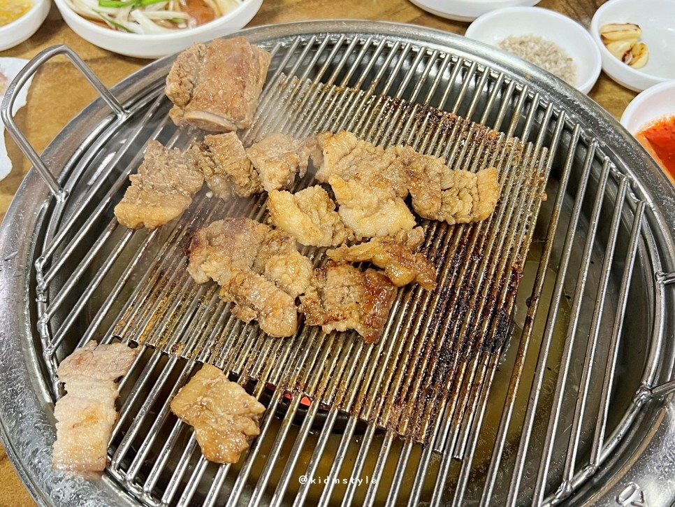 먹기 좋게 잘라두고 계속 구워줍니다. 삼겹살도 맛있는데 돼지갈비도 정말 맛있어요. 대신동 사는 분들은 아마 이집 모르는 분 없으실 겁니다.