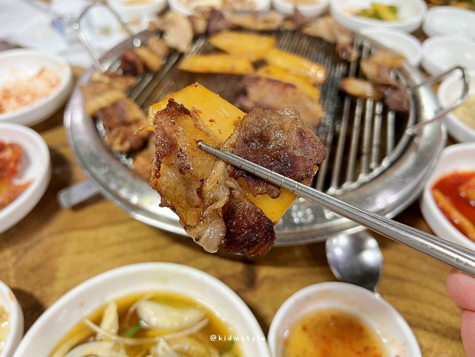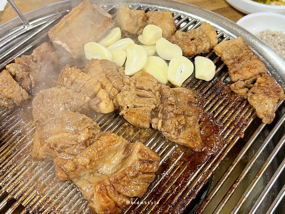 흐름 끊기지 않게 돼지갈비도 바로 올려줍니다. 양념이 많은 갈비를 굽기에 괜찮은 불판이에요. 조금 탔다 싶으면 판을 갈아주십니다.