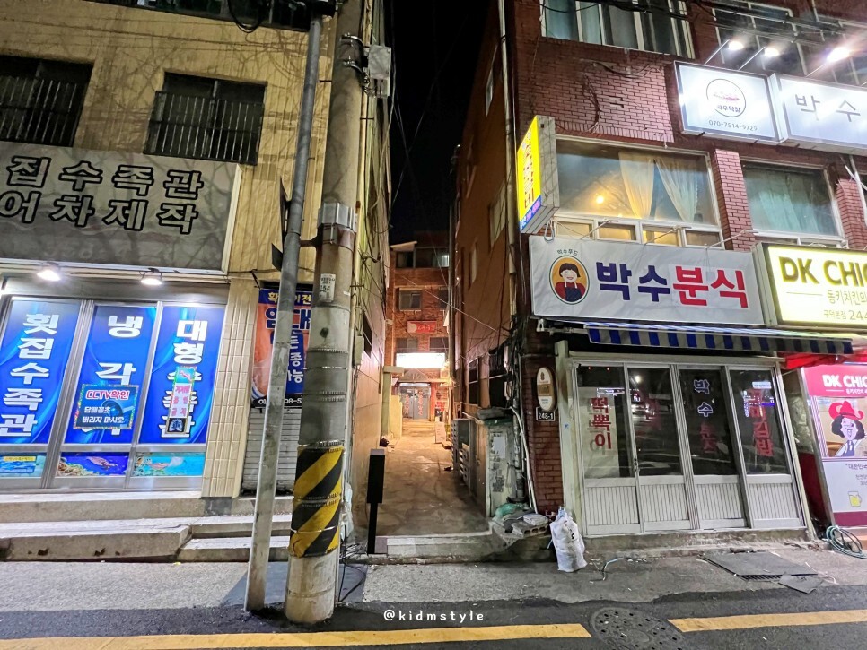 골목을 나오면 바로 구덕운동장 맞은편 대로변이에요. 요즘 핫한 박수식당과 박수분식도 보이네요. 박수식당도 오픈 초반에 엄청 자주 가던 집인데 반갑습니다. 2층으로 옮겼네요.