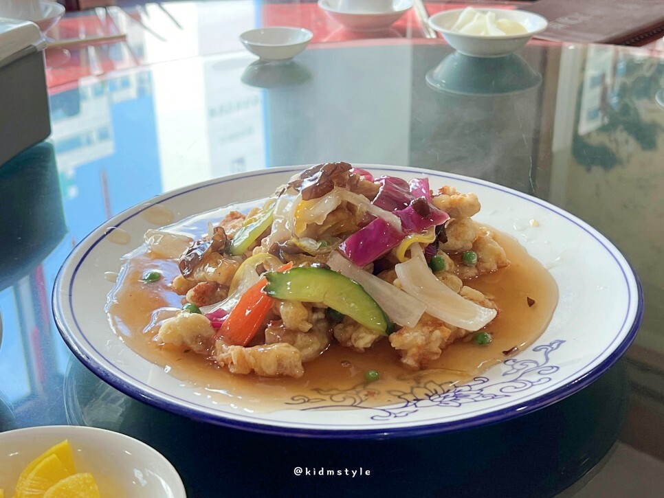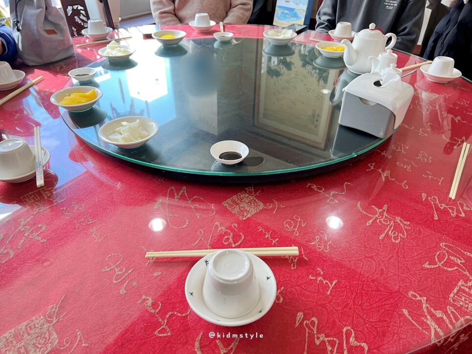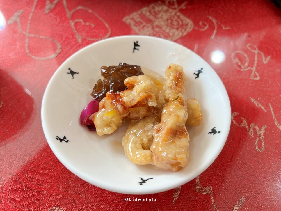 원탁 테이블을 돌려서 앞접시에 탕수육을 좀 담아줍니다. 소스가 그리 과하지 않고 잘 튀긴 탕수육이라 한잔하기 참 좋습니다. 물론 점심이라 술은 안 시켰습니다.