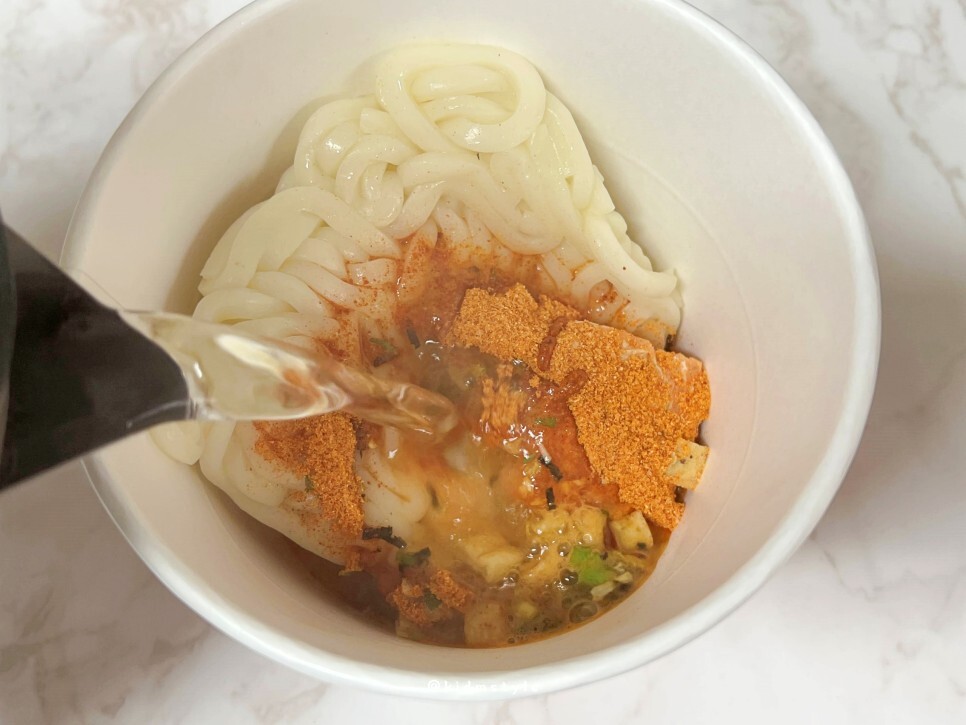 용기에 면, 분말스프, 후레이크, 김치블럭을 넣고 끓는 물을 용기 내 표시선까지 부어줍니다.