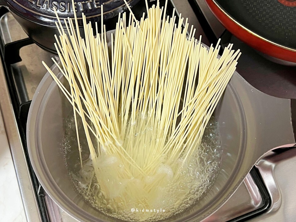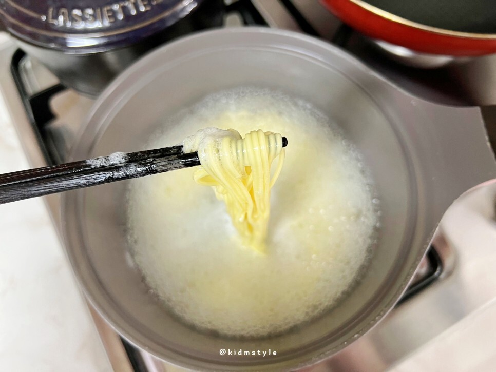 물이 끓으면 면을 쫙 퍼트리며 냄비에 넣어줍니다.