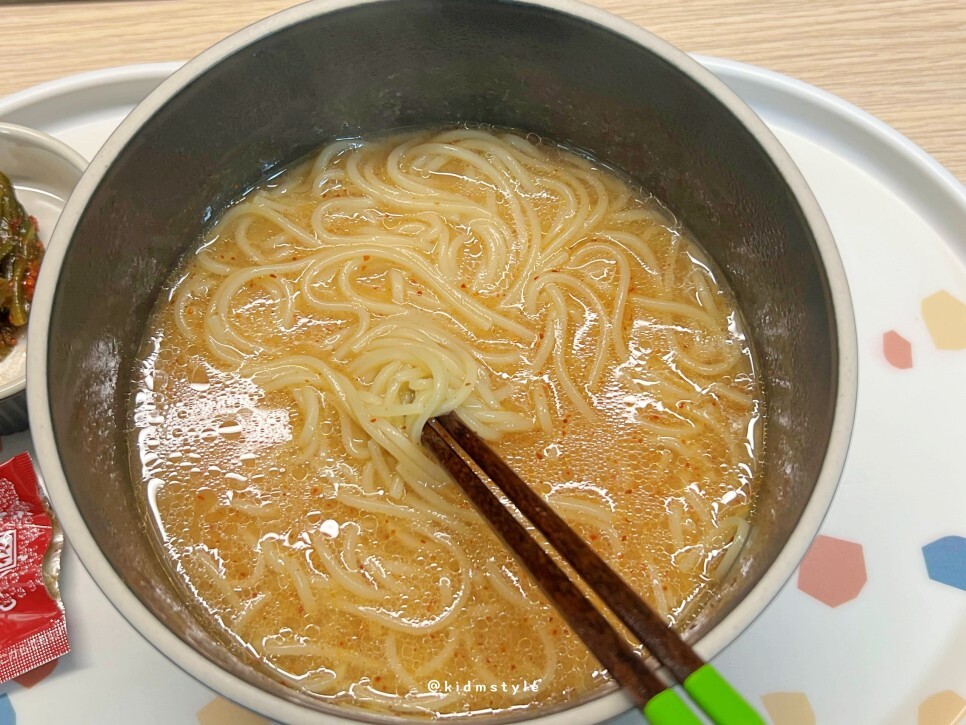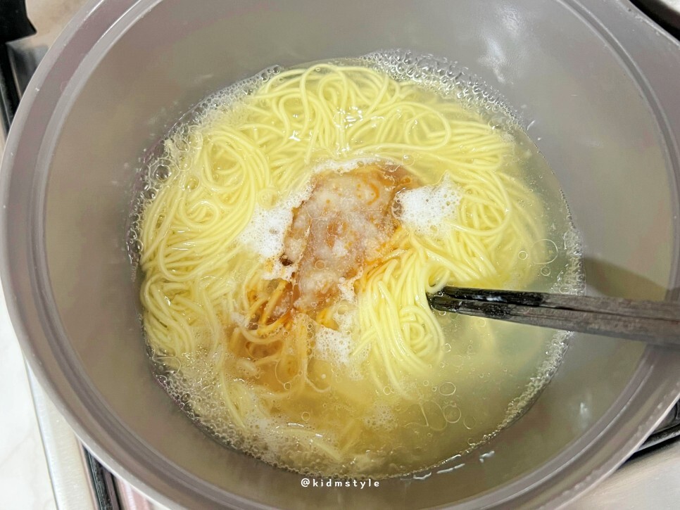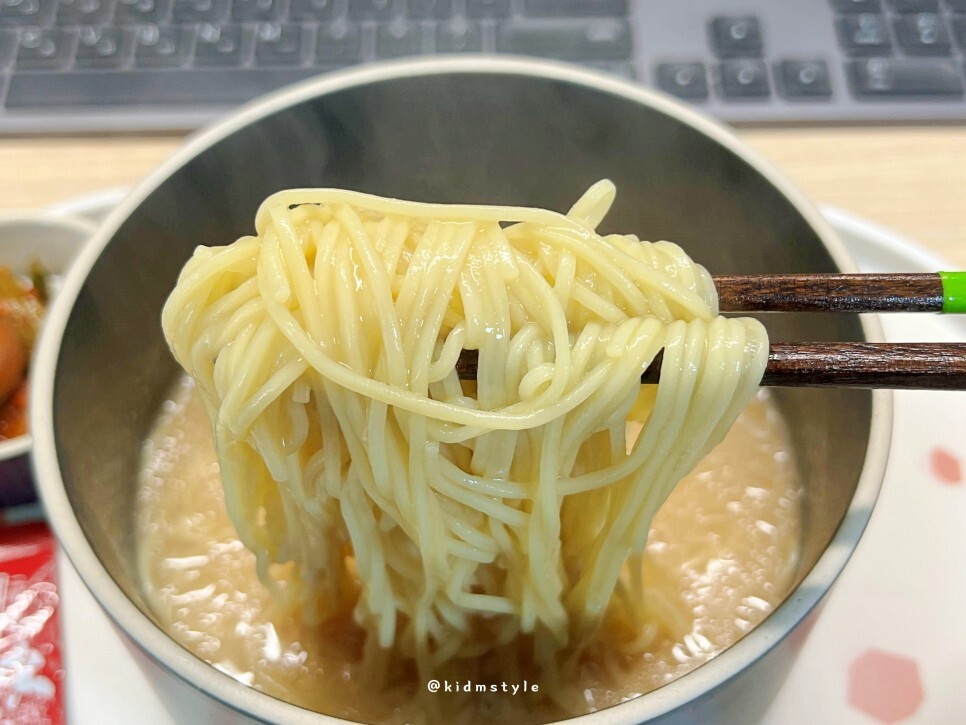 다만, 조리법의 기본 시간인 2분 30초로 조리할 경우 먹으면서 면이 빨리 퍼지기 때문에 조금 단단한 면의 식감을 원한다면 2분 30초보다 덜 삶는 게 낫더군요.