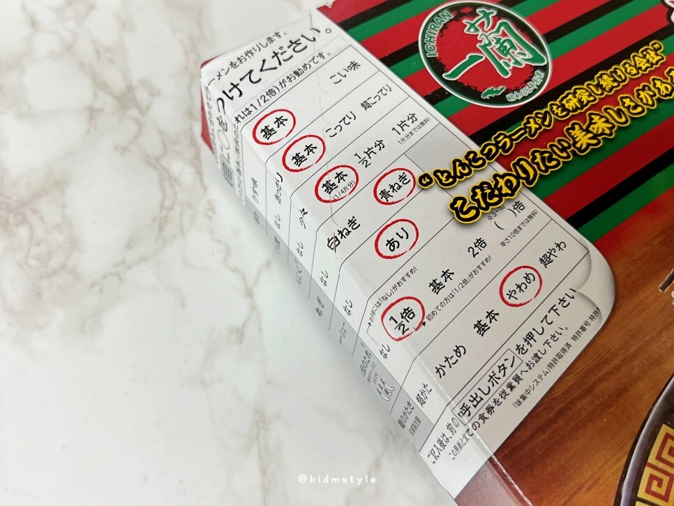 이치란 라멘에 가서 드신 분들은 익숙하시죠? 이것저것 체크해서 주문하는 방식인데 그 종이가 상자에 인쇄되어 있네요.