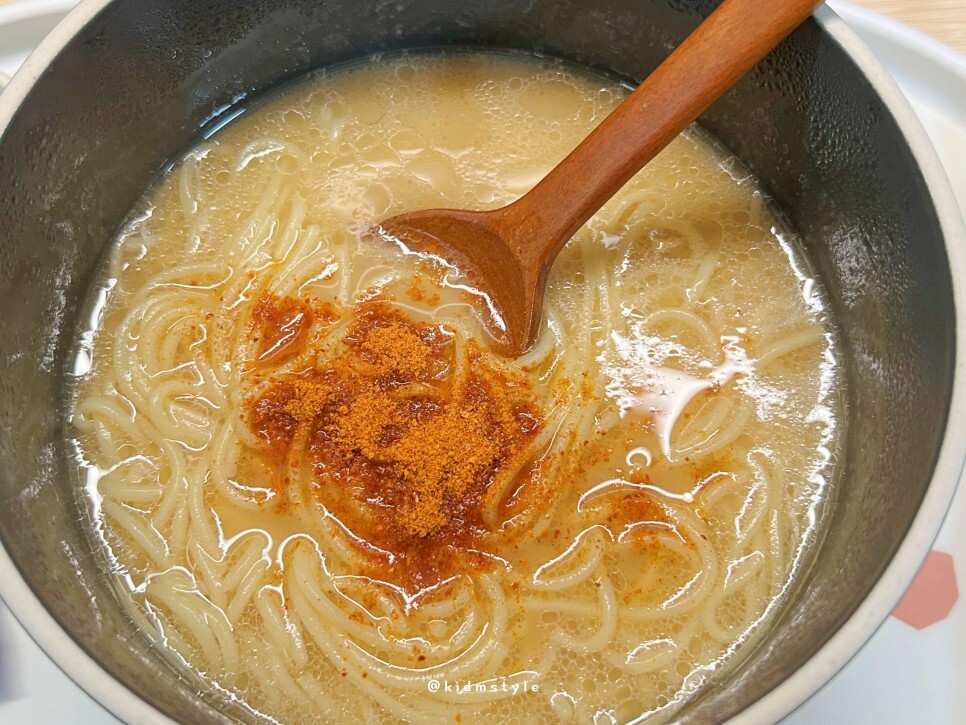 1인분 기준, 물 450ml를 끓이고 원하는 면 익힘에 따라 시간을 조절하고 불을 끈 후 소스를 넣고 취향에 따라 고춧가루 시즈닝을 넣어서 맛보면 됩니다.