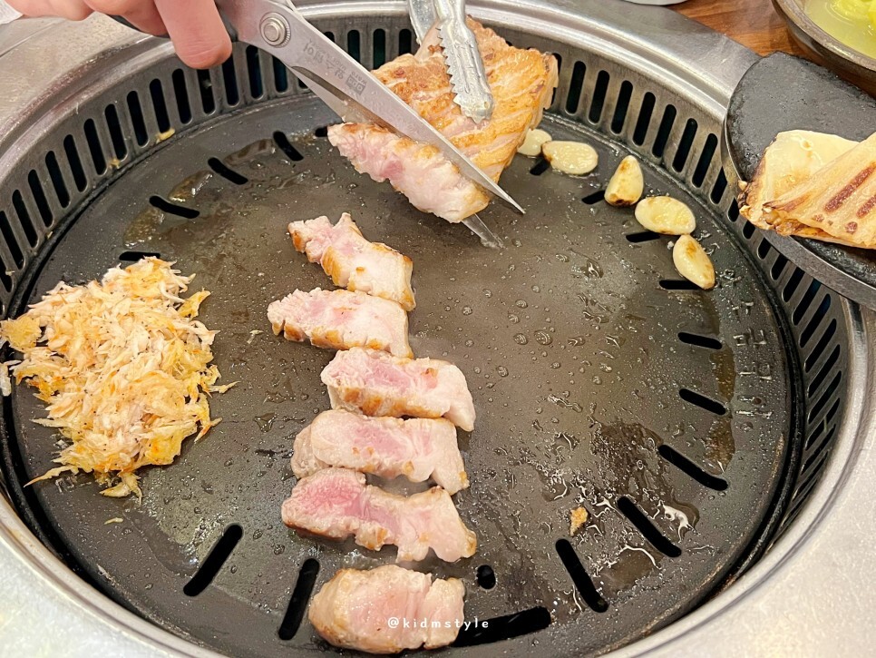 새우는 꺼내 올려주고 고기를 제대로 구워줍니다. 진짜 맛있게 굽지 않았나요?