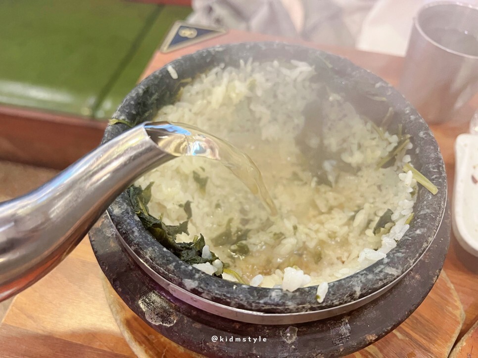밥을 어느 정도 비우고 뜨거운 물을 부어주면 누룽지가 완성됩니다. 밥 양이 꽤 많아서 과식했어요.