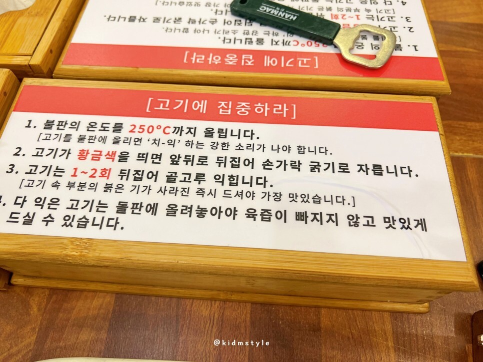고기를 굽는 방법이 수저통에 친절하게 적혀있어요. 직원분들이 고기를 구워주는 곳이니 걱정하지 않으셔도 됩니다.