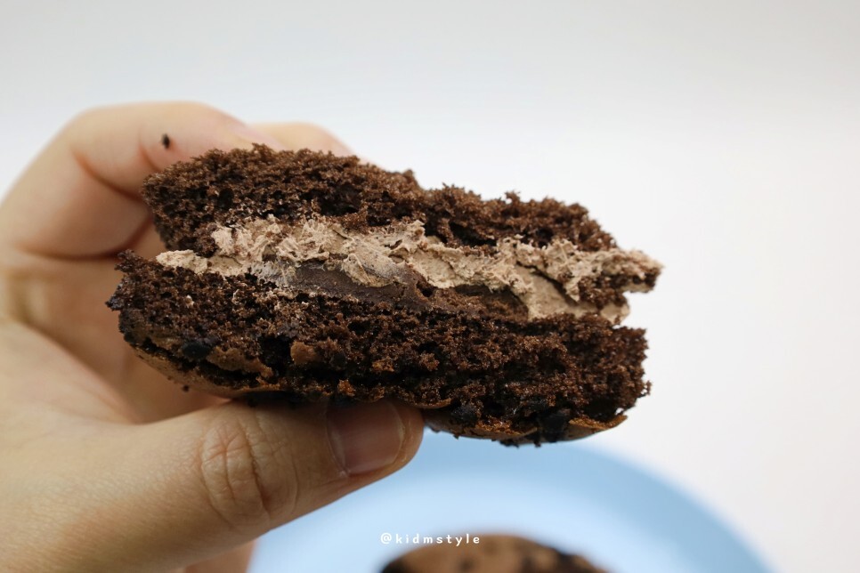 빵을 들고 반을 갈라보았습니다. 속에 크림이 알차네요. 빵에는 초코크런치가 곳곳에 박혀 있어서 씹는 식감을 제공해 줍니다.