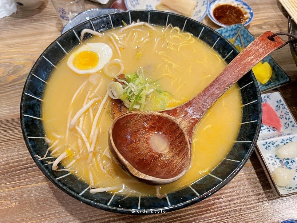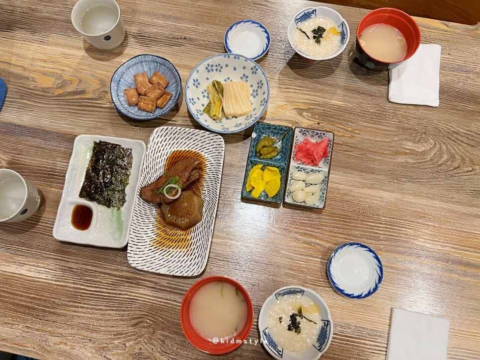 하나하나 차려지기 시작합니다. 돈코츠라멘 국물과 죽으로 먼저 속을 좀 달래줍니다.