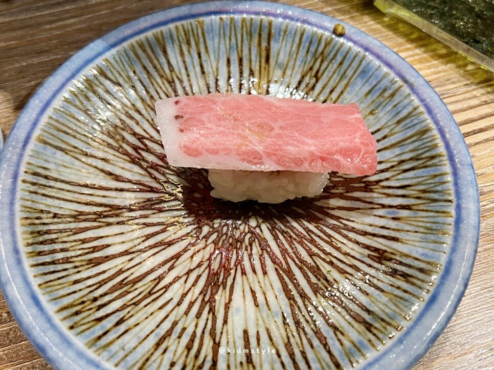 이어서 참다랑어 턱살 가마도로는 초밥으로 맛봅니다. 와사비 듬뿍 올려서 맛보니 너무 좋아요. 소주 한 잔도 술술 들어가고요.