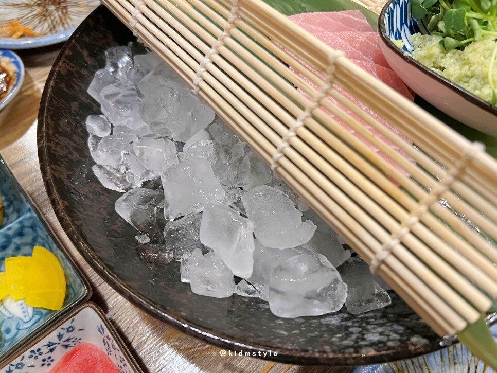 참치 아래에는 얼음이 한가득 들어가 있어서 냉기를 어느 정도 유지해 주고요. 열심히 먹고 있는데 업장 내에 깔리는 음악이 참 좋네요. 90년대 노래 위주로 나오는데 진짜 추억의 노래가 많이 나와서 너무 즐거웠습니다.