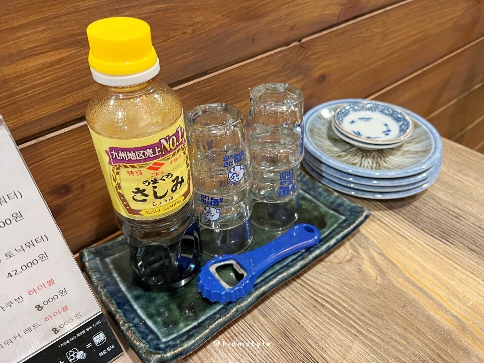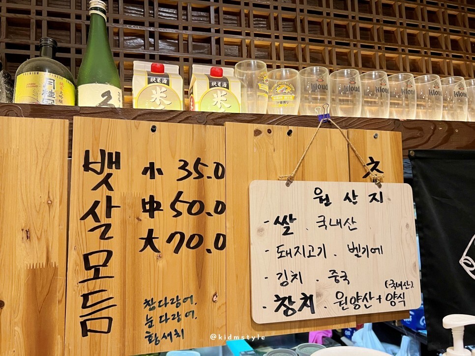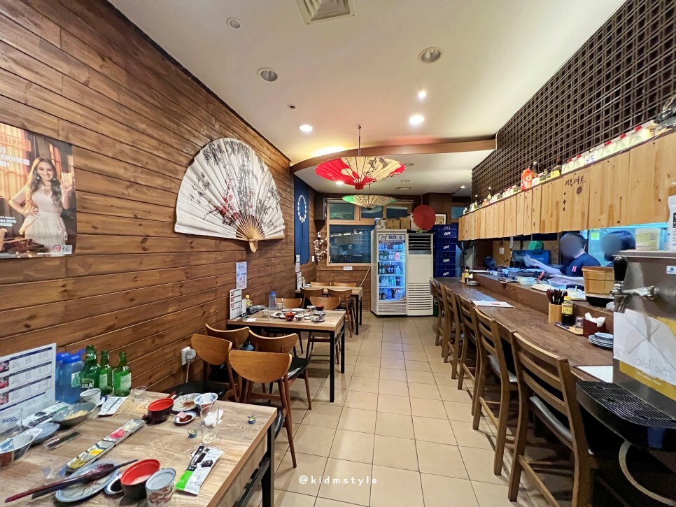 저녁시간이 한참 지나고 방문했는데요. 마침 손님들이 빠지고 나서 내부를 찍어봅니다. 테이블 3개가 있고 혼술 하기 좋은 다찌 자리도 보입니다. 배달의민족으로 주문이 가능해서인지 주문이 꾸준히 들어오더군요. 저도 다음에 1인 혼술 세트로 주문해서 먹어볼 생각입니다.