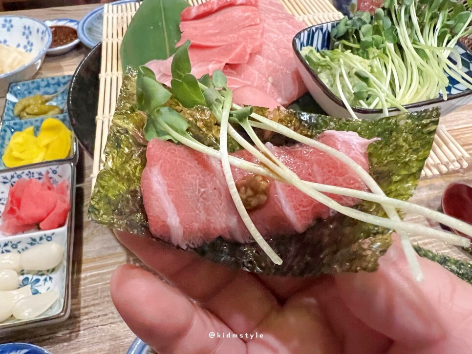 그냥 먹으며 참치 본연의 맛을 즐겨야 하는데 무의식적으로 김에 싸 먹습니다. 맛있네요.