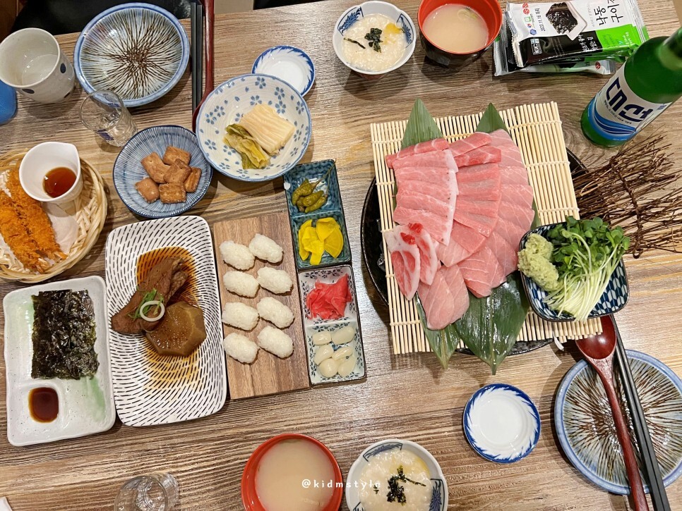 테이블이 채워지기 시작합니다. 때깔 좋은 참치가 나왔네요. 오래간만에 맛보는 참치의 맛이 기대가 됩니다.