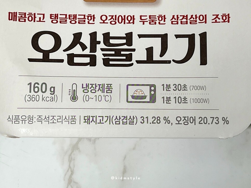 매콤하고 탱글탱글한 오징어와 두툼한 삼겹살의 조화 오삼불고기 너무 기대됩니다. 160g에 360kcal이며 냉장 보관해야 합니다.