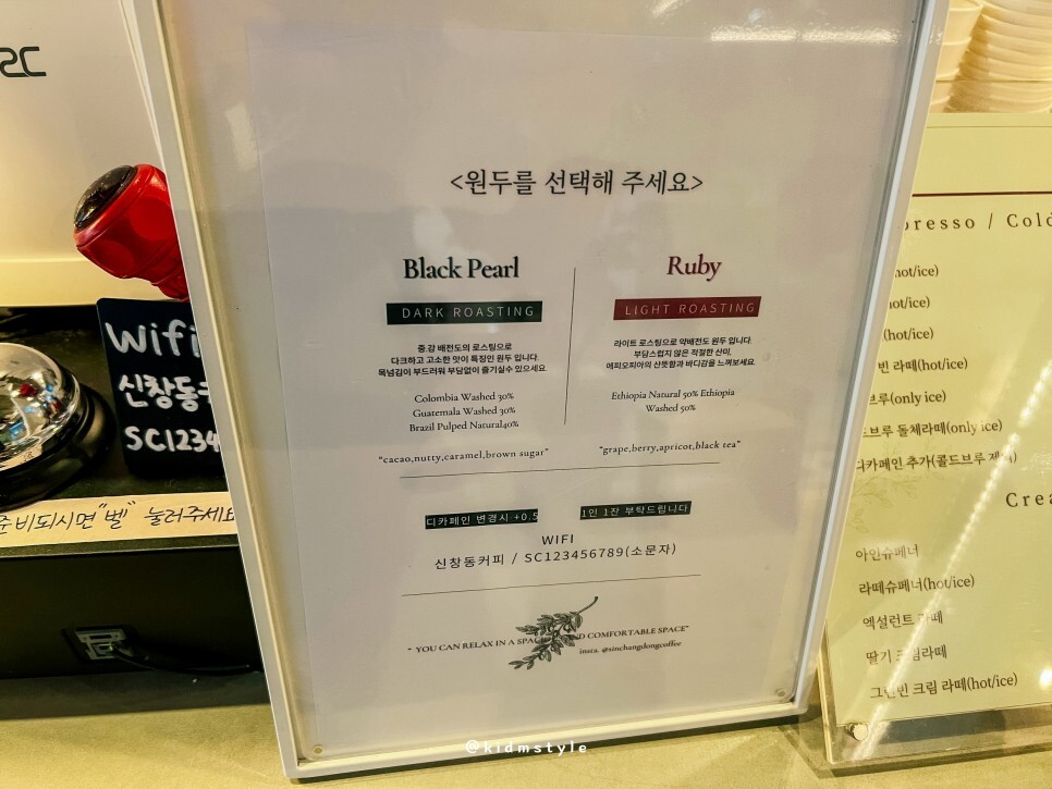 다크와 라이트 2가지 원두를 선택할 수 있는데요. 500원 추가하면 디카페인도 가능해요.