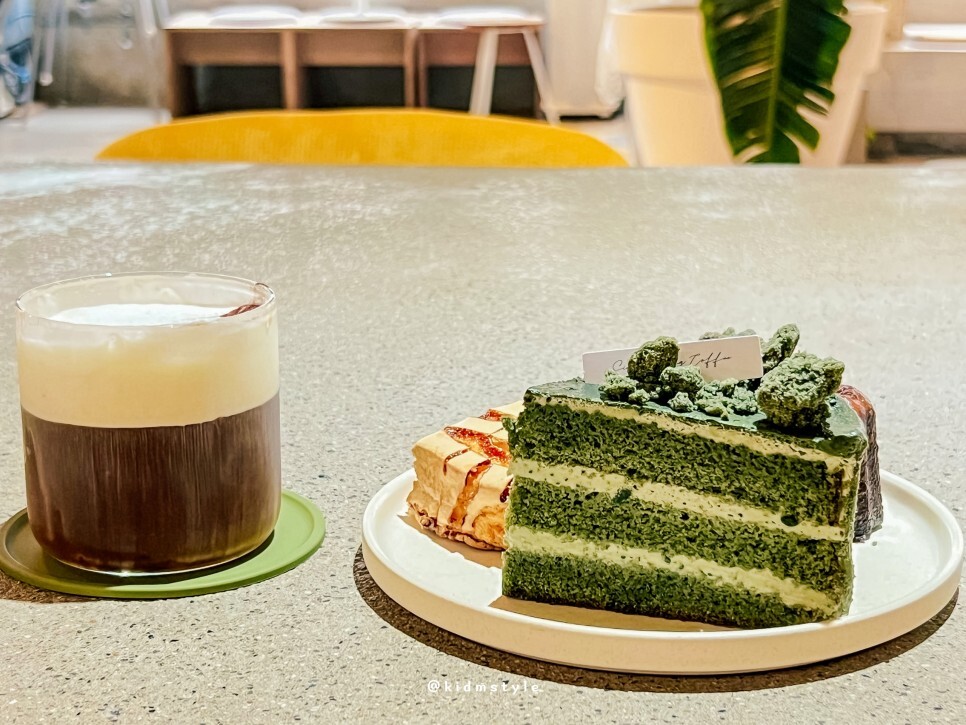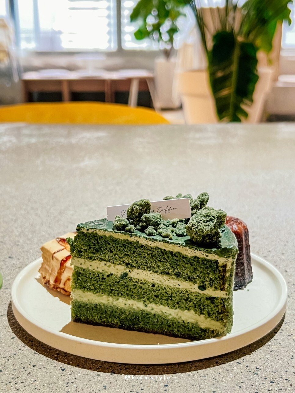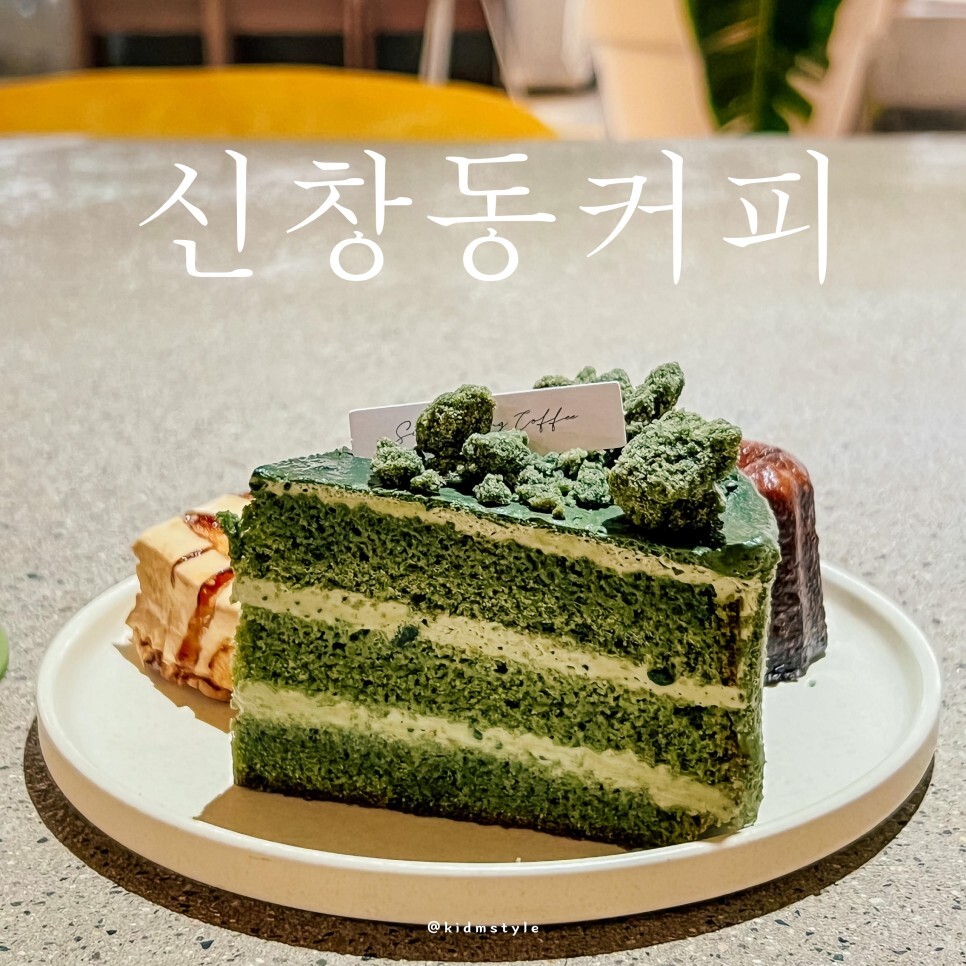 신창동커피에서 직접 만들어서 여기에서만 맛볼 수 있는 쑥 케이크인데요. 고소하고 향긋한 쑥 향이 매력적이며 쑥 크럼블까지 올라간 케이크라 기대가 많이 돼요.