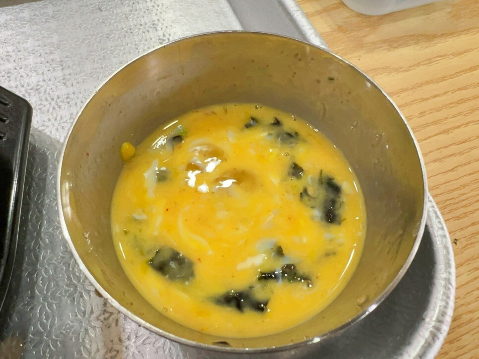 수란에 콩나물 국물을 몇 숟가락 넣고 김가루까지 넣고 휙휙 저었어요. 그리고 맛보면 참 고소하고 맛나답니다. 조금 남겨서 뚝배기에도 부어줍니다. 개인 취향껏 맛보시는 것을 추천드려요.