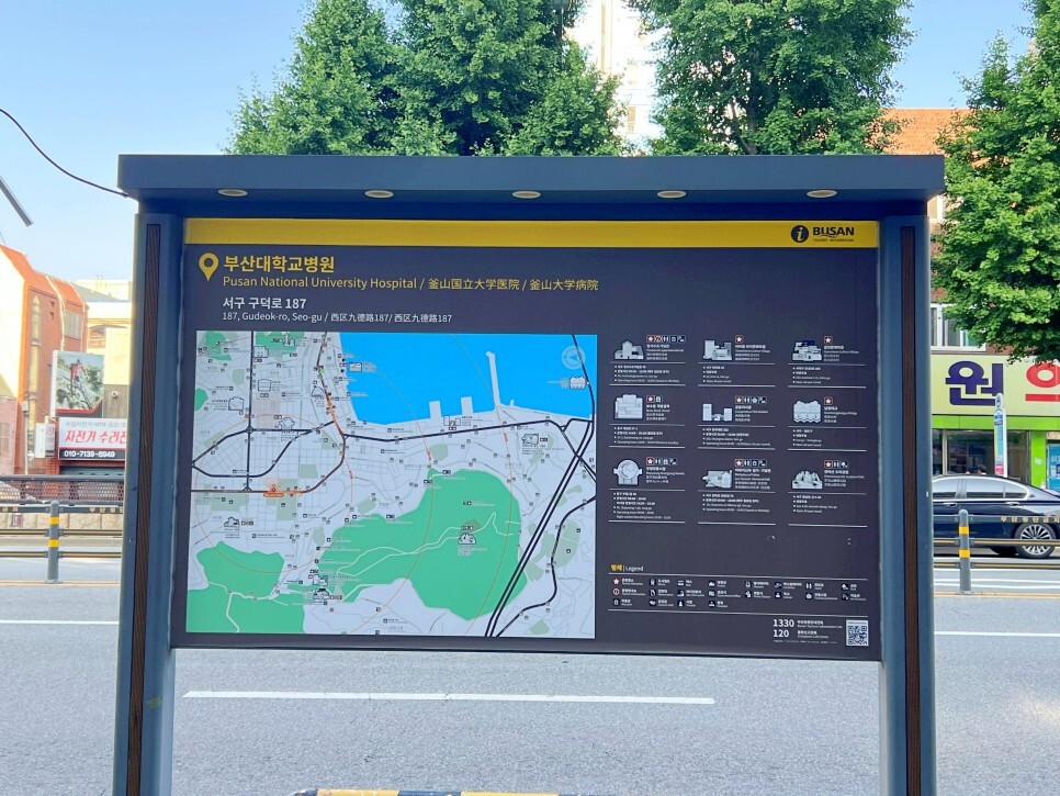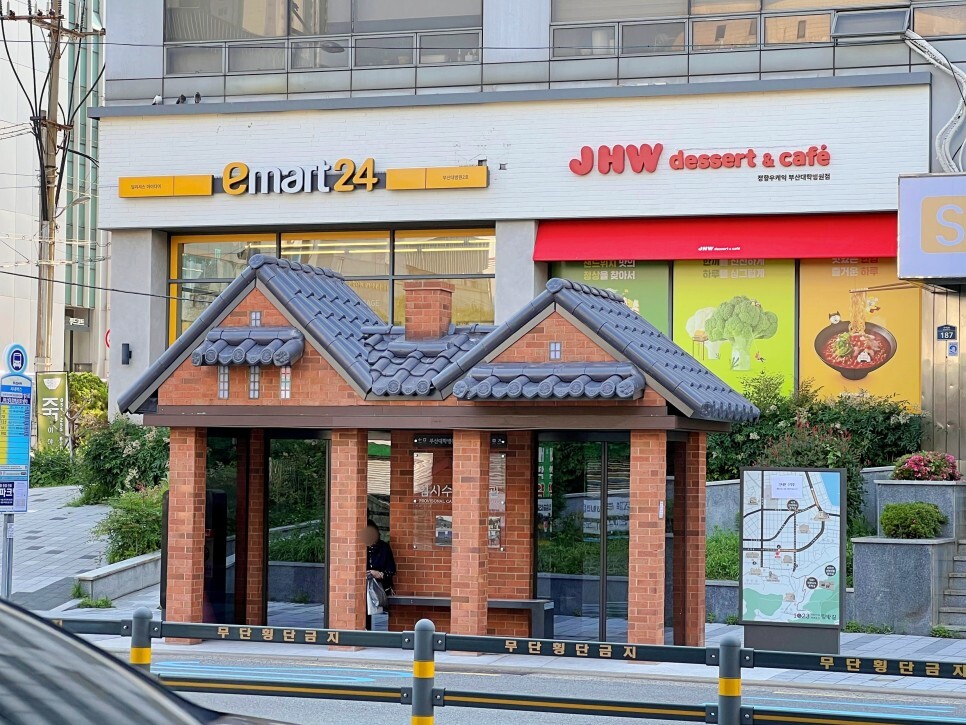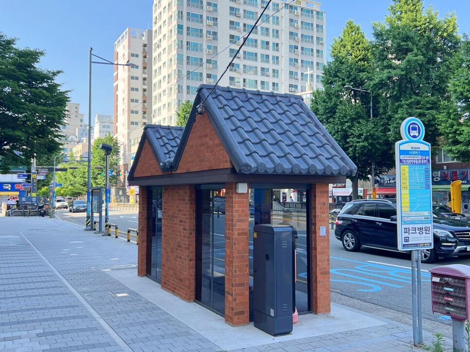 부산대학교병원 버스정류장인데요. 좀 특이하죠? 올해 초, 1023 피란수도 세계유산 탐방길을 조성하면서 새롭게 지은 정류장입니다. 근처에 있는 임시수도기념관의 모습을 본떠서 만들었습니다.