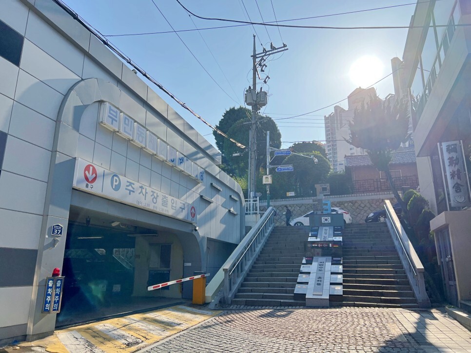 걷다 보면 부민동 제2공영주차장과 계단을 만날 수 있는데요. 주차는 여기에 하시면 될 거예요.