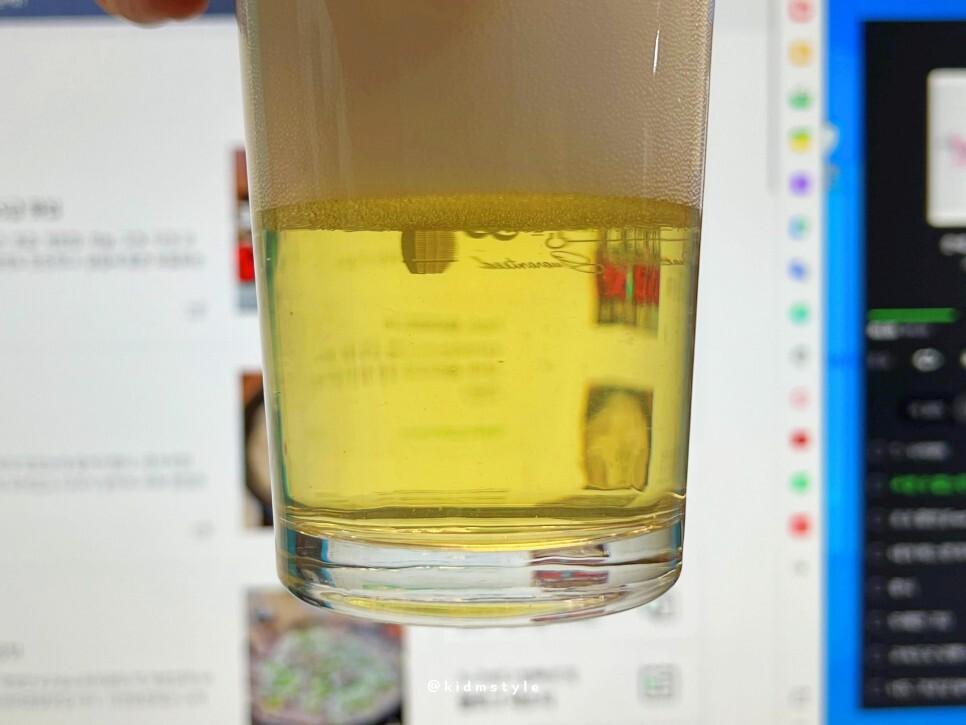 색깔은 이렇습니다. 맛을 보기 전에 맡아보니 향은 별로 안 나네요. 첫 모금에 후르츠 등 과일의 향이 확 올라옵니다. 과한 느낌은 아니고 기분 좋은 맛이에요.