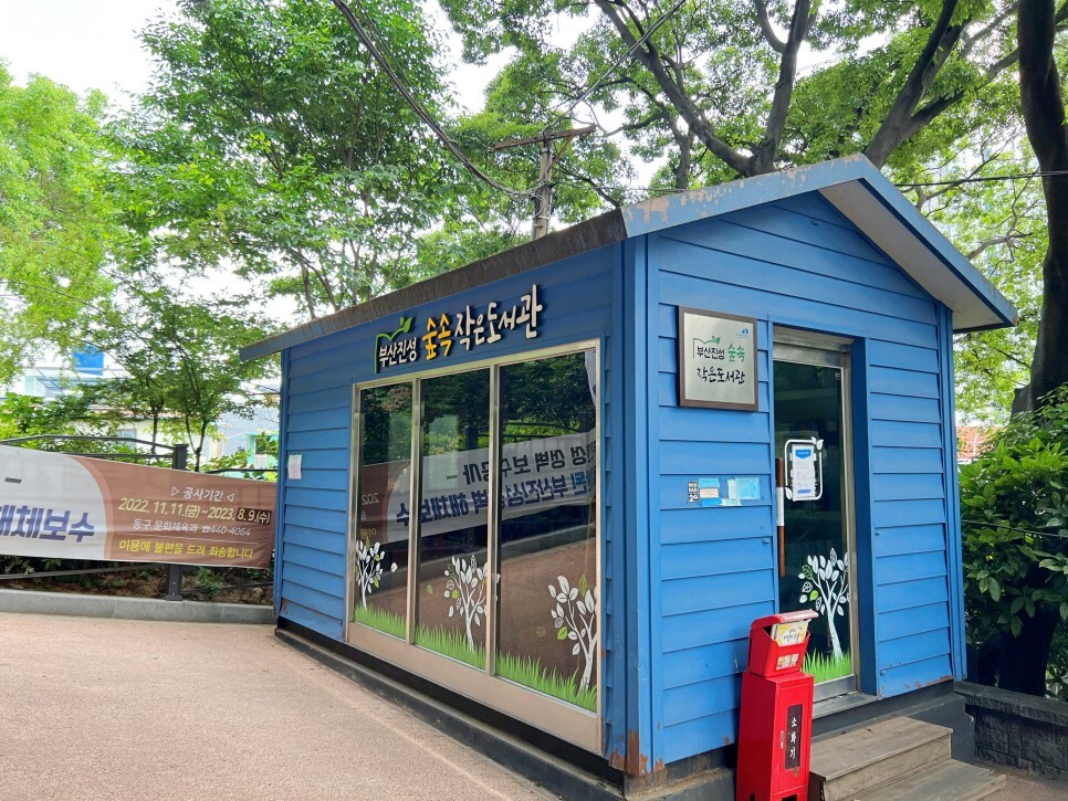 공원을 천천히 걸어보기로 합니다. 날씨가 무더운 날이었는데 수풀이 우거진 공원에 들어오니 시원한 바람이 불고 좋습니다. 부산진성 숲속 작은도서관에서 독서를 잠시 즐길 수도 있어요.