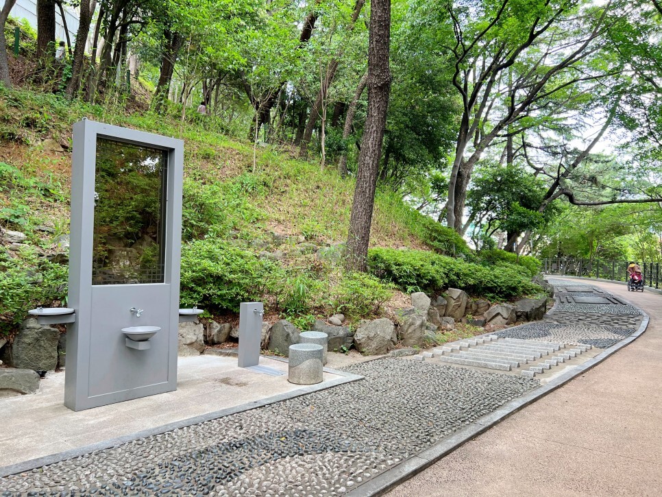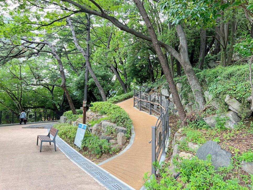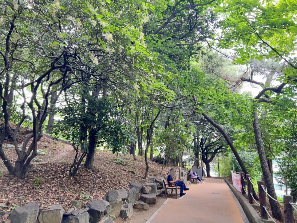 공원의 산책로는 걷기 좋게 잘 조성되어 있어요. 어르신들도 많이 걷고 계셨는데요. 울창한 나무들이 햇빛을 적당히 가려주고 시원한 바람이 부니 더위를 피해 산책하기에 참 괜찮다는 생각이 들었습니다. 곳곳에 쉬어갈 수 있는 벤치도 많고요.