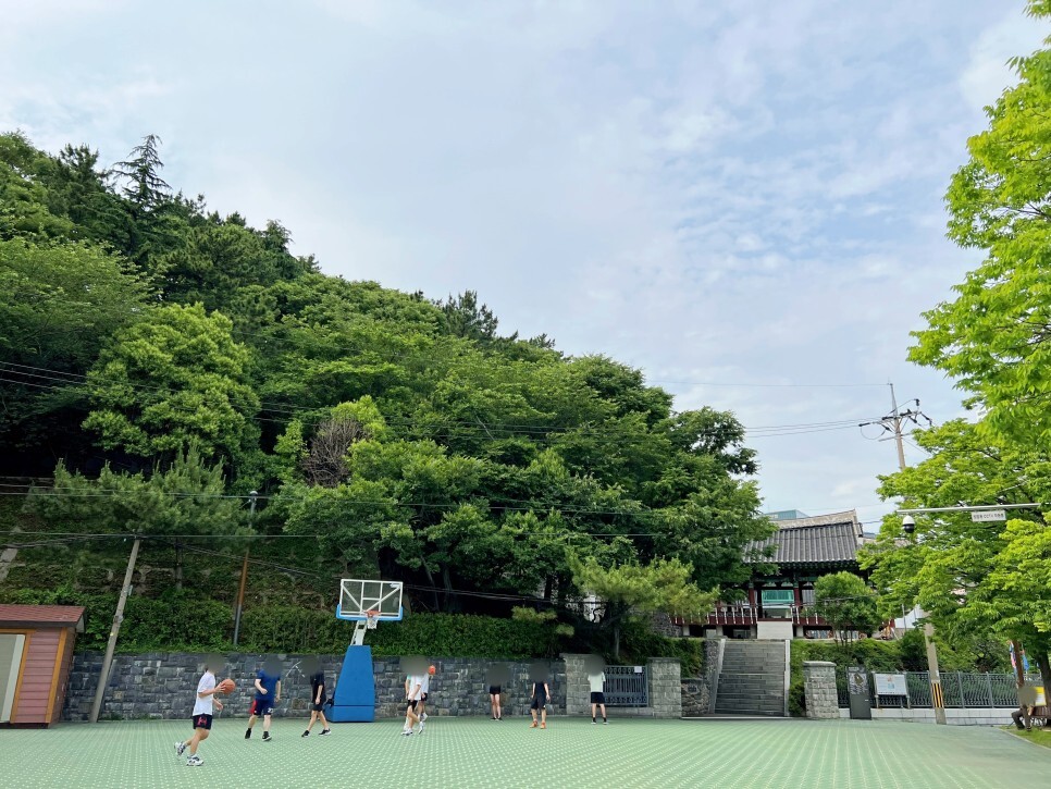 부산진성공원 남쪽 영가대 옆에는 넓은 광장이 있습니다. 학생들이 즐겁게 농구하는 모습이 일상 속의 역사적인 공원이라는 느낌을 주는 것 같아 더 멋집니다. 예전에는 이쪽을 경계로 바깥쪽은 전부 바다였다고 하네요.