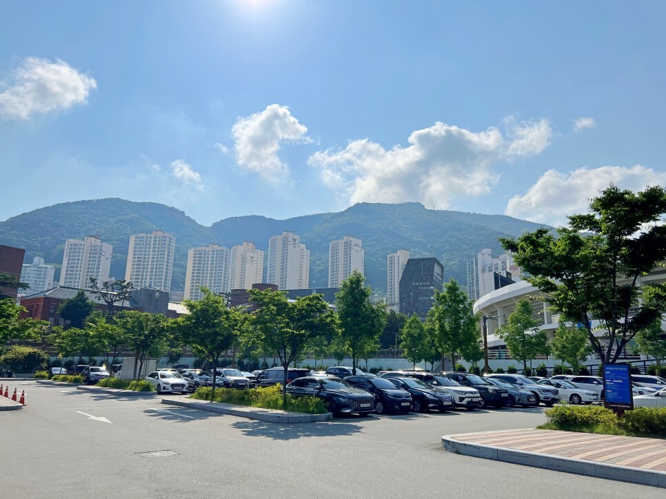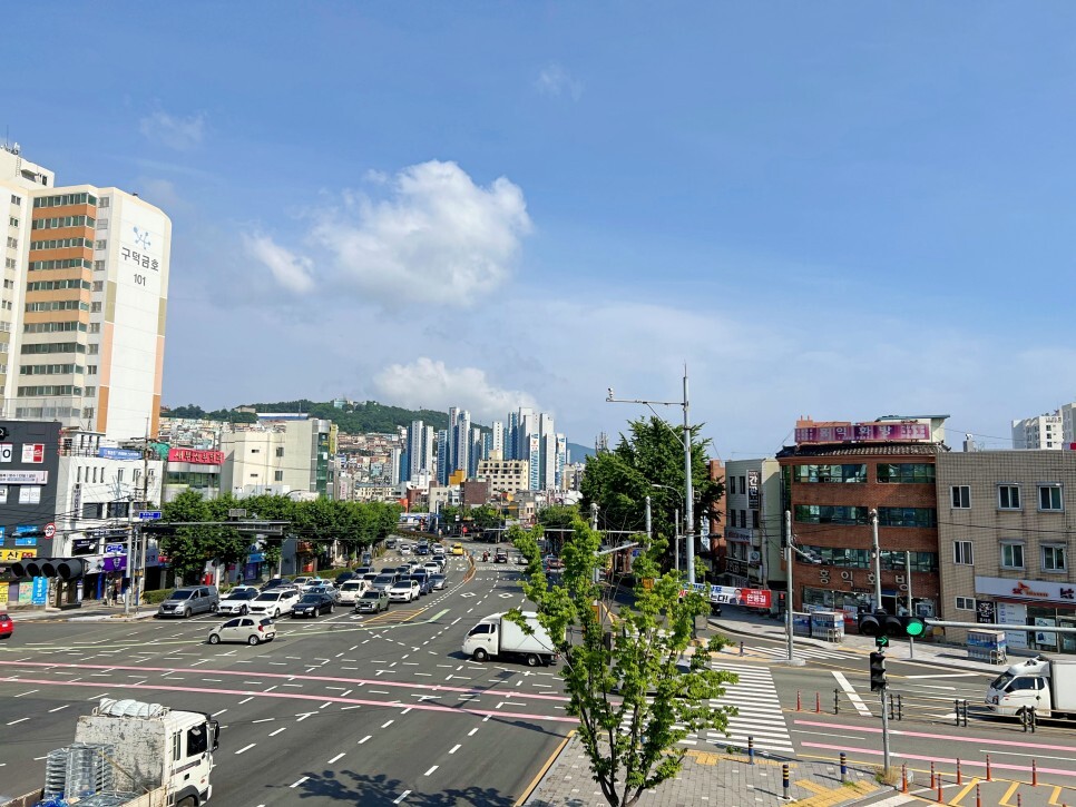 반대 방향으로 바라보았어요. 저 멀리 보이는 언덕 같은 산은 민주공원 쪽이에요. 부산시립중앙도서관이 바로 보입니다.
