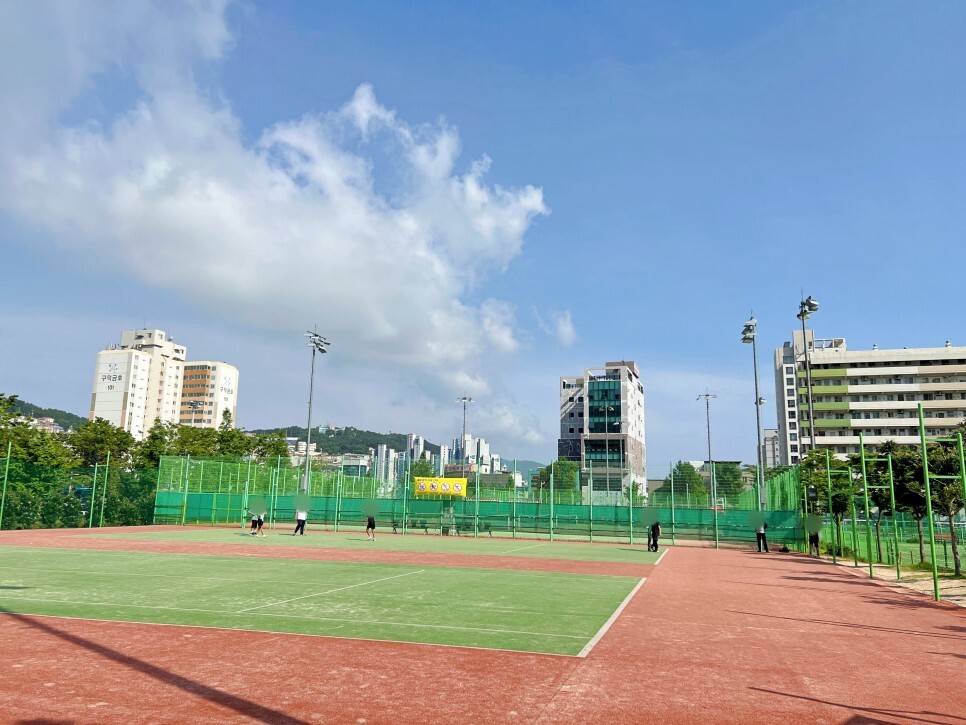 정면에 보이는 건물은 부산국민체육센터라는 시설입니다. 수영, 배드민턴 등 다양한 운동을 즐길 수 있는 시설이라 동네 주민에게 인기가 꽤 많아요.