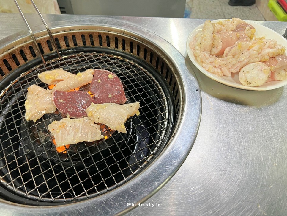 염통이 빨리 익으니까 먼저 맛보라고 한 점 올려주십니다. 소스에 찍어서 맛보니 부드럽고 너무 맛있네요.