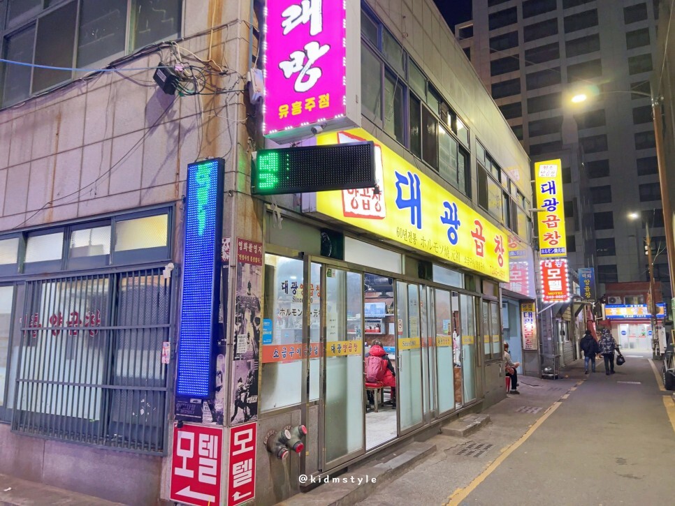자갈치 양곱창 골목이에요. 그 유명한 백화양곱창은 오른쪽에 있고 오늘 찾아갈 곳은 대광곱창입니다. 이곳 역시 60년 전통의 업장입니다. 백화양곱창처럼 여러 가게가 자리하고 있는 코너식입니다.
