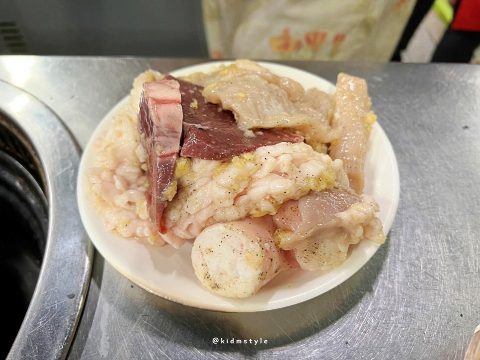 소금구이 모둠 한접시가 나왔습니다. 염통, 대창, 특양 등의 구성인데요. 마늘 양념이 적당히 되어 있습니다. 오래간만에 맛보는 양곱창이라 너무 기대가 됩니다.