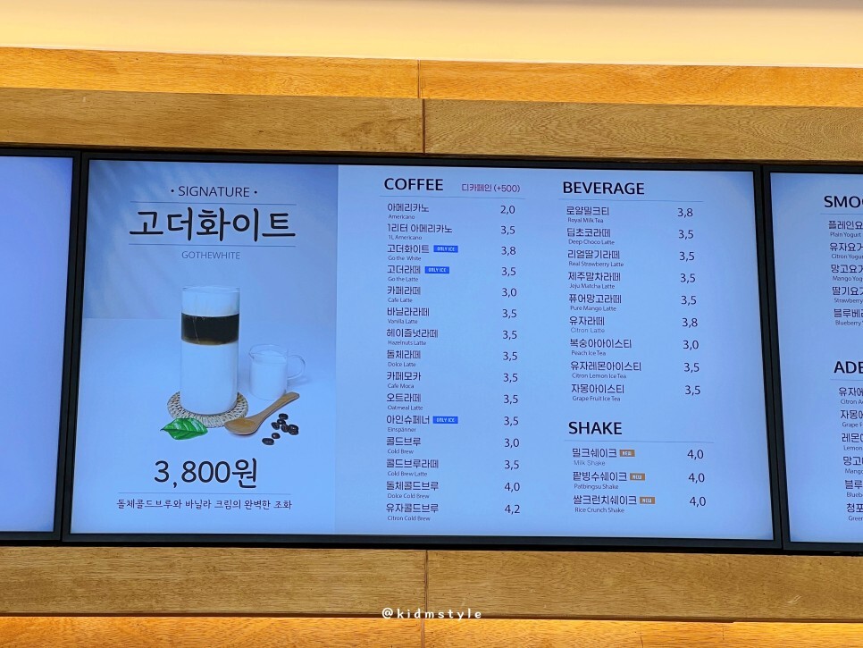 메뉴판을 살펴볼게요. 고더커피의 시그니처는 고더화이트입니다. 돌체콜드브루와 바닐라 크림의 조화가 돋보이는 메뉴이고요. 다양한 메뉴가 있어서 취향에 맞게 맛볼 수 있는 것 같아요.