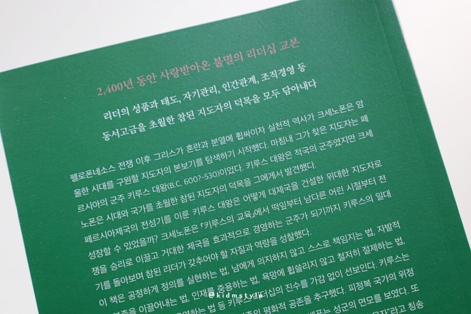 자기관리, 리더십 늘 머릿속에 맴도는 화두입니다. 오늘은 오래간만에 책을 하나 소개해 보려고 하는데요. 자기관리와 리더십에 대해 생각해 볼 수 있었어요. '키루스의 교육'이라는 도서 소개를 해볼게요.