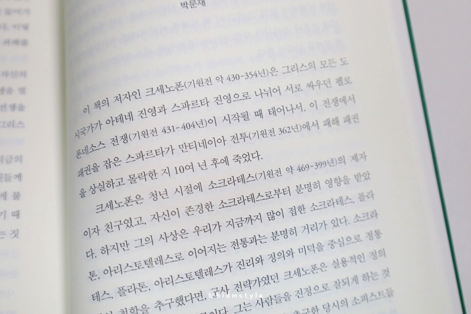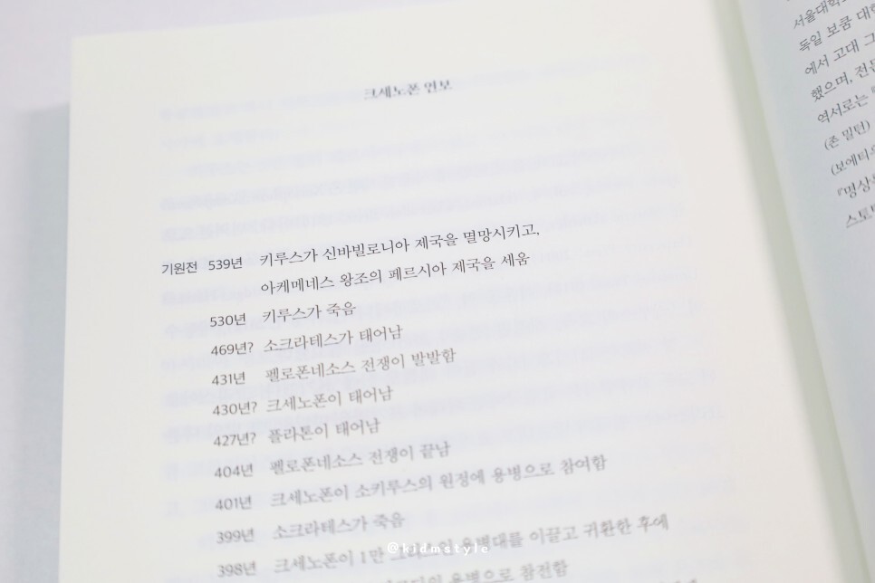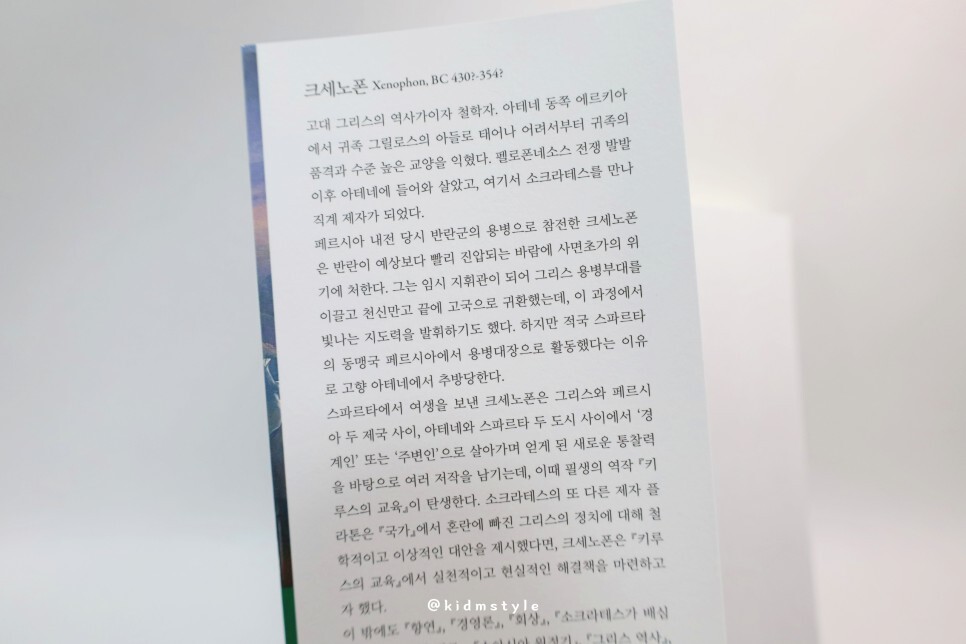 크세노폰에 대한 약력이 소개되는데요. 그리스와 페르시아 두 제국 사이, 아테네와 스파르타 두 도시 사이에서 '경계인' 또는 '주변인'으로 살아가며 얻게 된 새로운 통찰력을 바탕으로 여러 저작을 남깁니다.