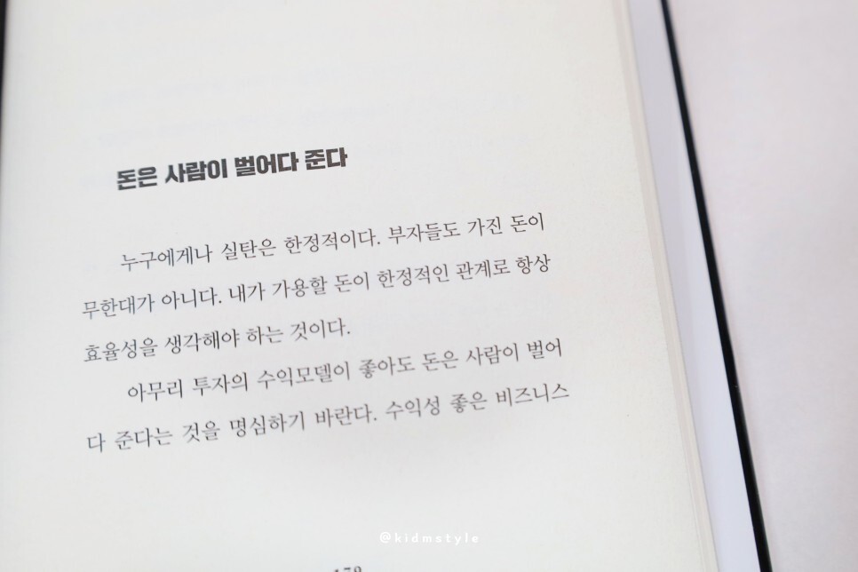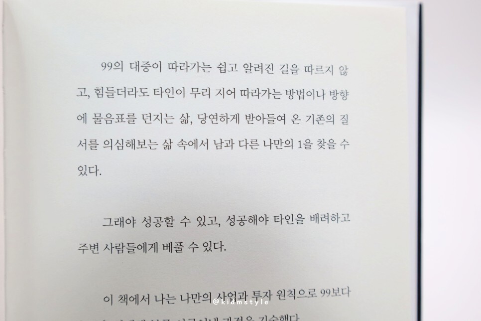처음 책장을 넘길 때 저는 식상했습니다. 일련의 책들과 매한가지라고 생각했거든요. 하지만 완독을 한 후 글을 쓰기 위해 이 사진을 다시 보았을 때 공감이 되더군요. 물론 저자의 수많은 노력이 뒷받침되었다는 점을 첨언하고 싶습니다.