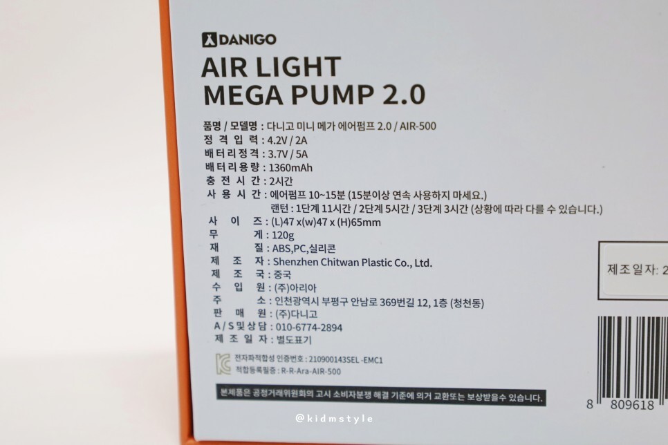 제품의 스펙이 상자 뒷면에 자세하게 나와 있습니다. 배터리 용량은 1360mAh이며 충전시간은 2시간입니다. 사용시간은 에어펌프 10~15분, 랜턴 1단계 11시간, 2단계 5시간, 3단계 3시간이 가능합니다.