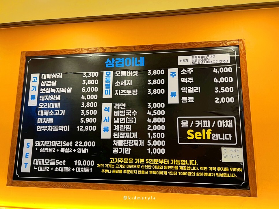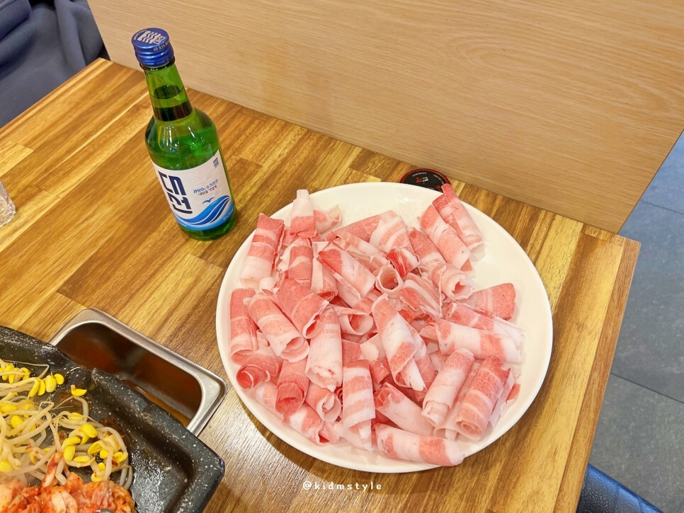 국내산 대패삼겹살 1인분에 3,300원으로 저렴해요. 삼겹살, 목살, 돼지양념, 오리대패 등 다양한 메뉴가 있으니 취향껏 주문하면 됩니다. 첫 주문은 5인분부터 가능하며 주류나 음료를 주문하지 않을 때만 1인당 1,000원의 상차림비가 발생합니다.