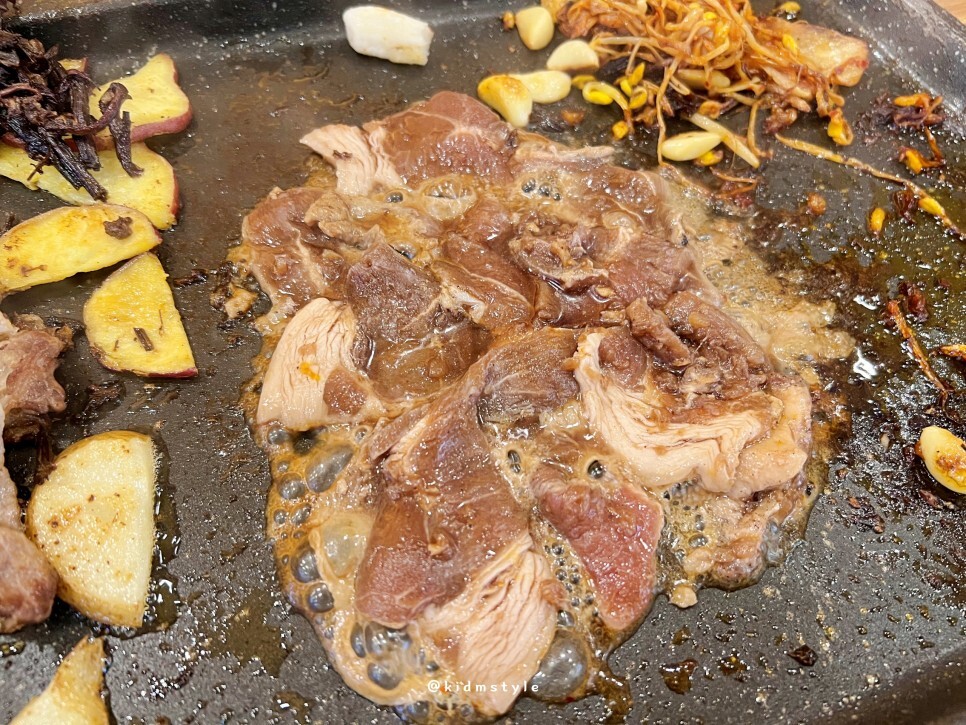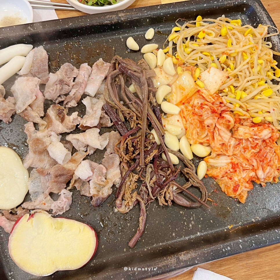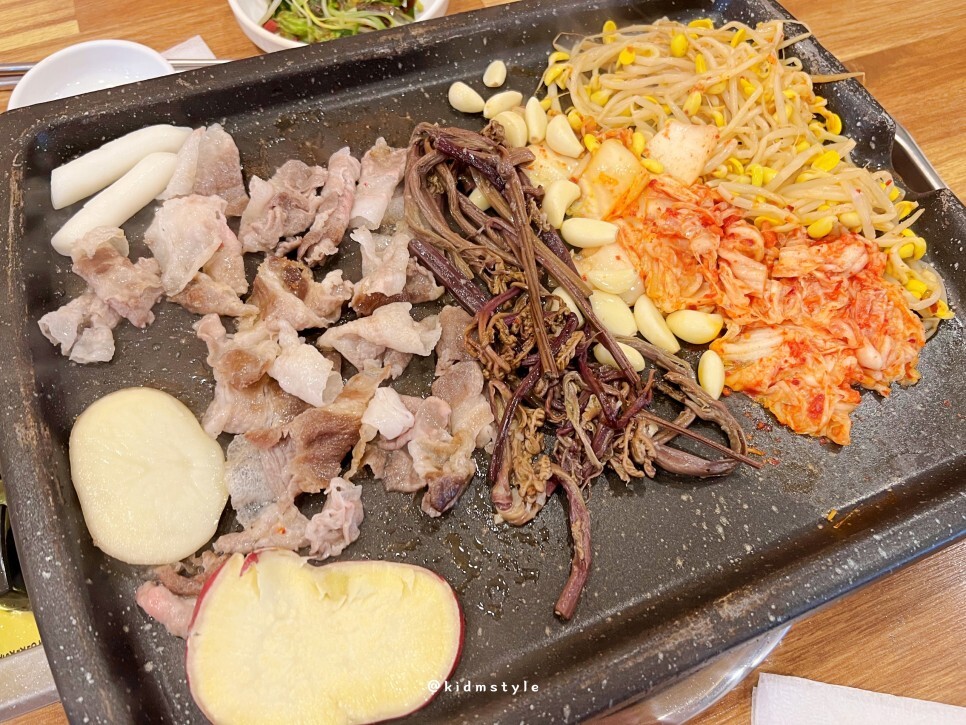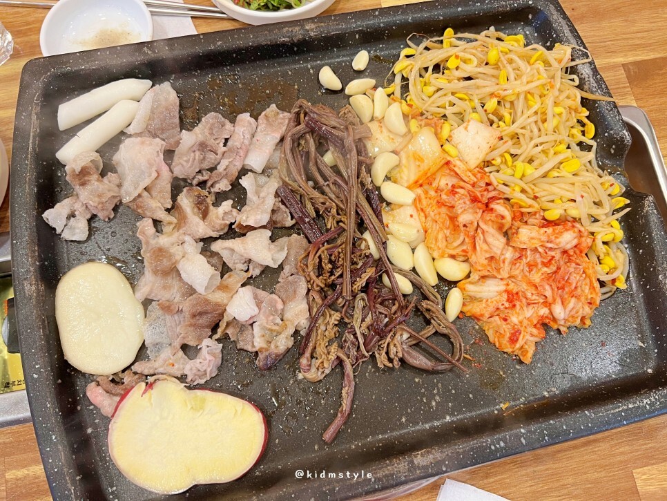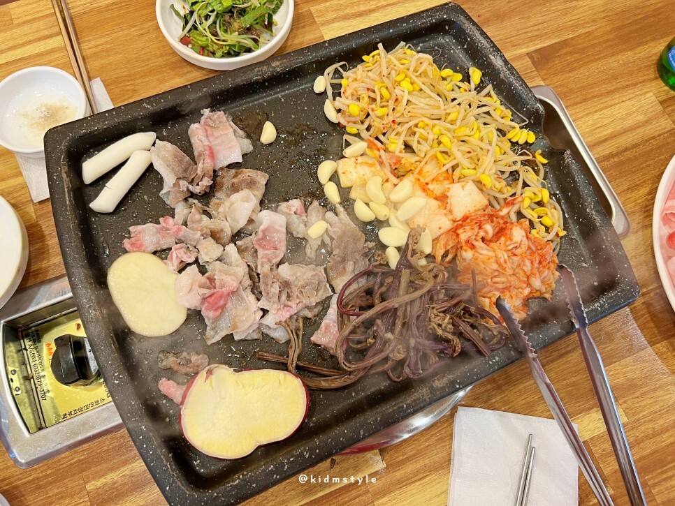 대패가 나오기 전에 셀프 코너에 가서 채소를 가지고 왔습니다. 구워 먹으면 너무 맛나요. 특히 고사리를 좋아합니다. 고구마도 구워 먹으면 달달하니 좋고요. 김치, 콩나물은 빠져선 안됩니다. 저는 고기도 좋아하지만 채소를 정말 좋아하는데 대패 먹으러 가면 늘 콩나물을 몇 접시 먹습니다.
