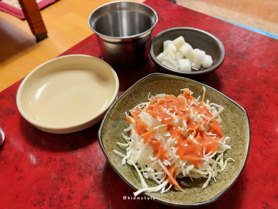 기본 제공되는 반찬은 양배추 샐러드 사라다와 치킨 무입니다. 사라다 좋죠.