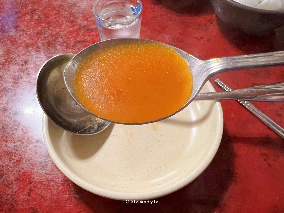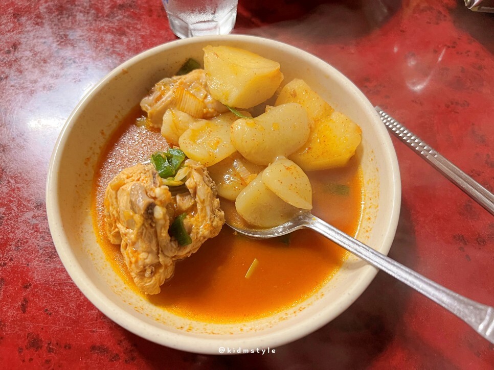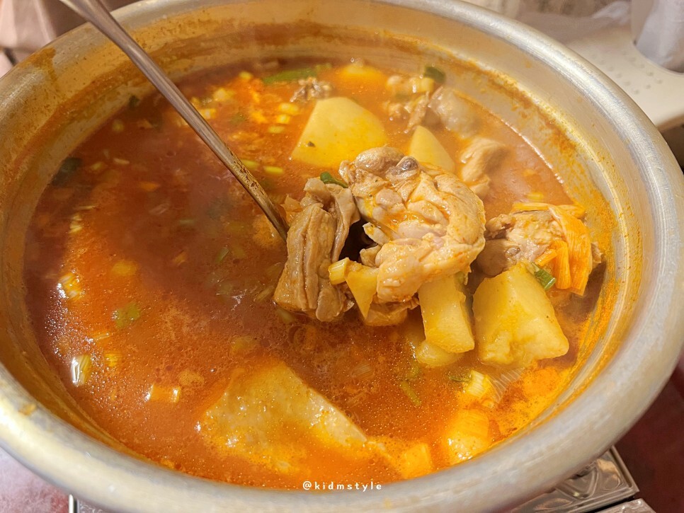 먼저 국물을 떠먹어봅니다. 이 집 닭도리탕의 장점은 국물입니다. 자극적이지 않고 조미료 맛이 과하지 않은 국물이라 인기가 많습니다. 처음 먹으면 조금 가벼운 느낌이 나기 때문에 졸여서 먹습니다. 졸이다 보면 더 먹기 좋더군요.