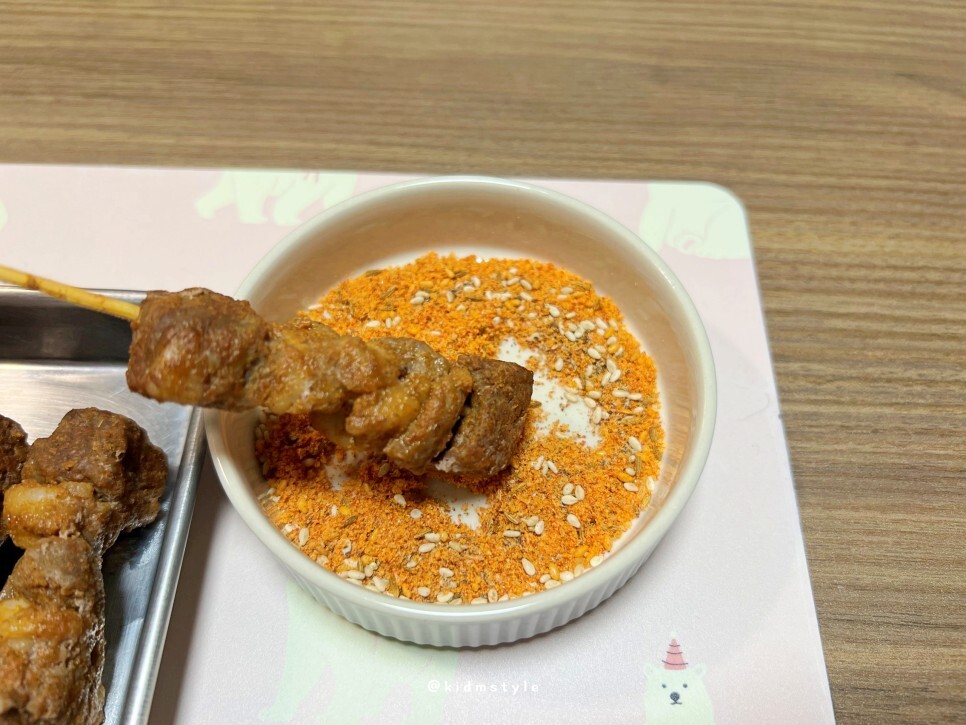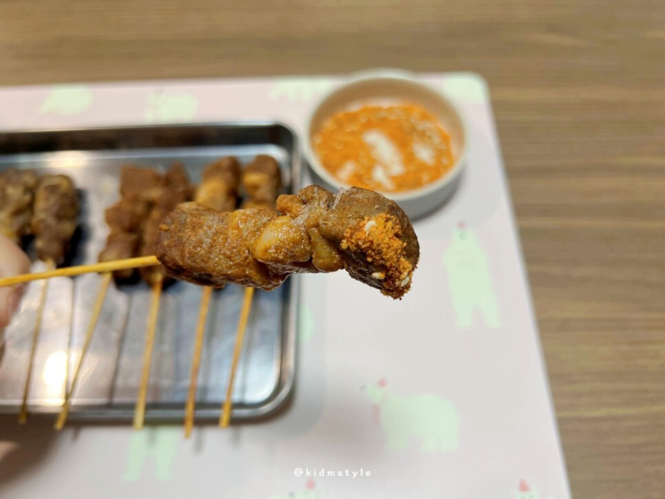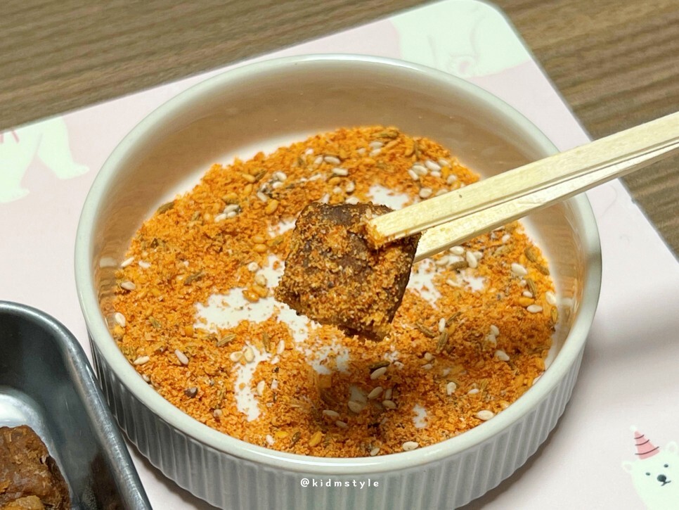 쯔란시즈닝에 찍어 먹기도 해요. 시즈닝에 설탕이 약간 들어가 있는지 조금 달달하네요.